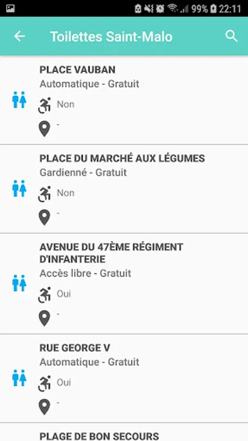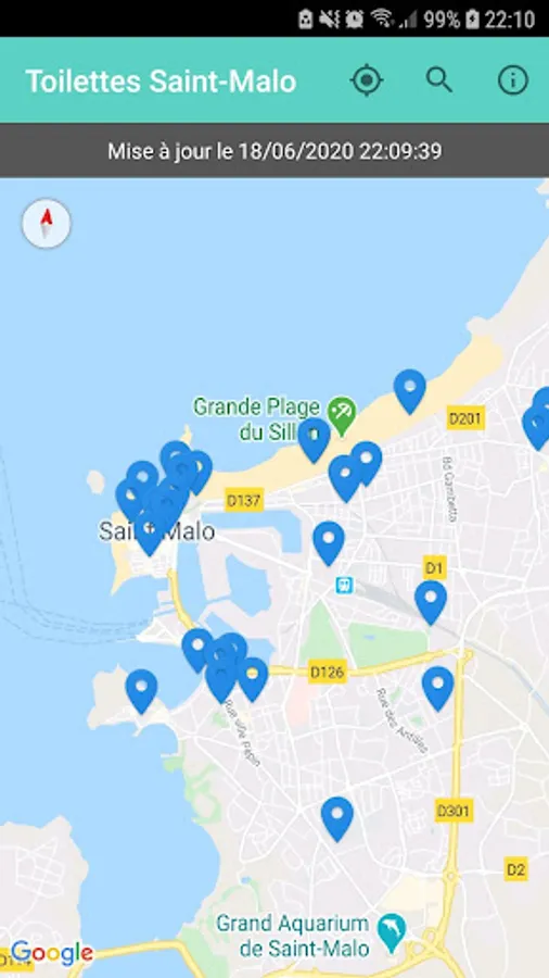 Saint-Malo Toilets is an application allowing you to view the location of public toilets in Saint-Malo.