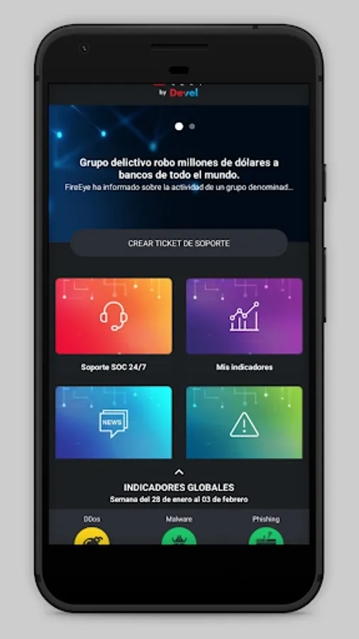 Mobile application for managing the SOC / CERT service of DevelSecurity. In this you can find relevant information about cyber threats in the region, as well as a channel for all 24/7 communication in a secure way in real time with SOC operators.