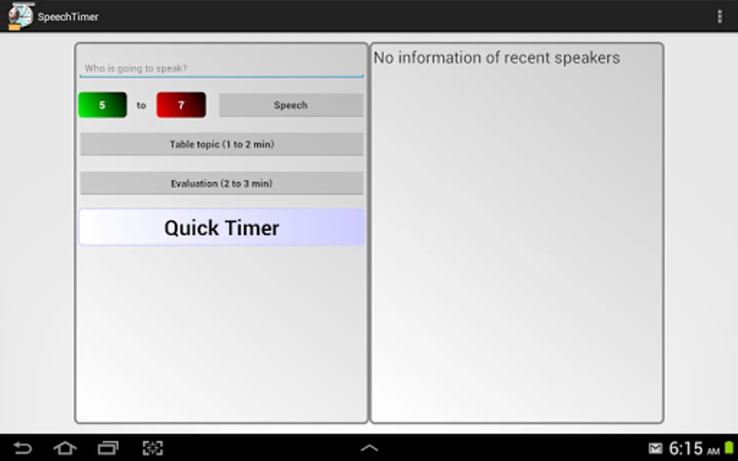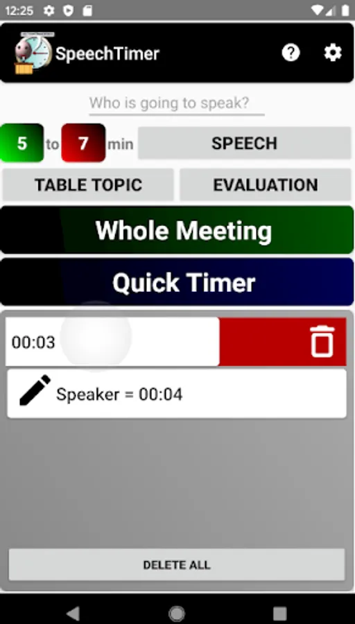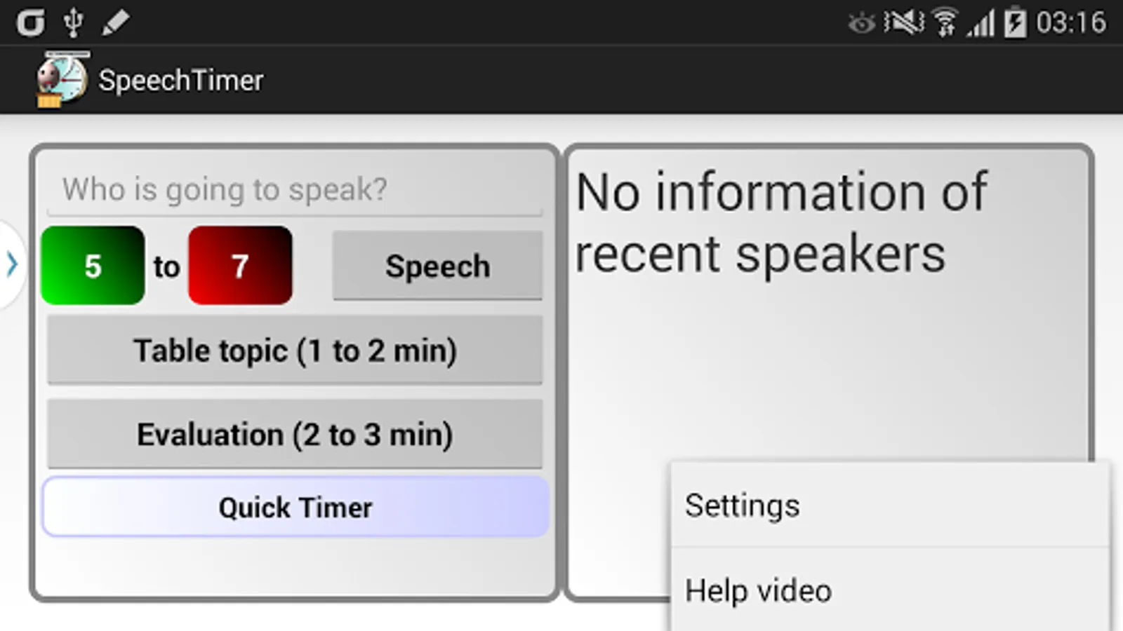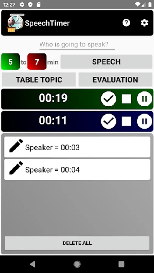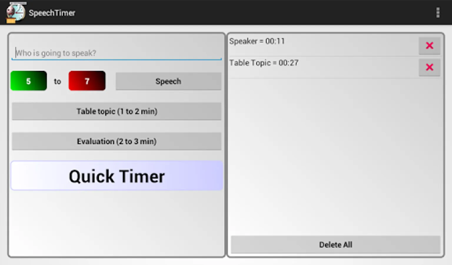 Speech Timer can be used by timers in toastmaster meeting. The app has a timer which changes it's background to green, yellow and red depending on in which state the speech is.