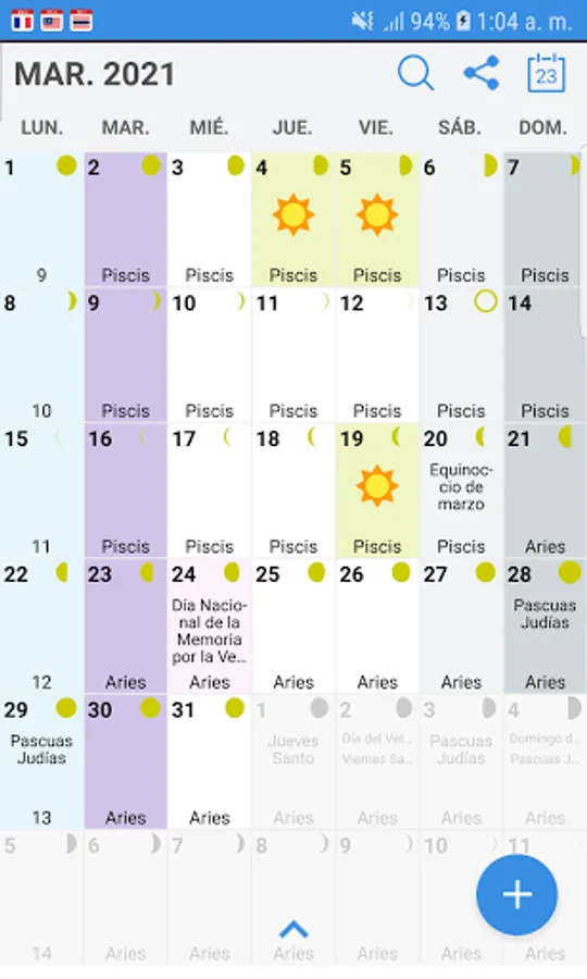 The calendar is available in Spanish if the phone is set to Spanish locale. English version is also available. You may also enable or disable Hebrew or Islamic Calendar in the "Settings". Week Number, Zodiac and Moon Phases are available. You may enable/ disable these in the "Settings".