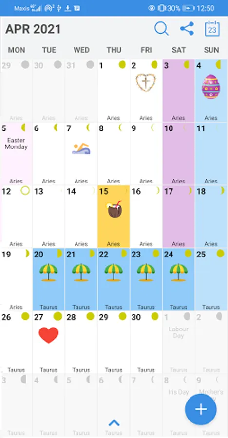You may add your own daily, weekly, monthly or annual events. You can use it to track your own diary of events such as planning your vacation, sports events or your friends and families' birthdays. The events are tagged with colorful icons for easy reference. It is simple to create the events. You may easily create multiple repeated events at one go.