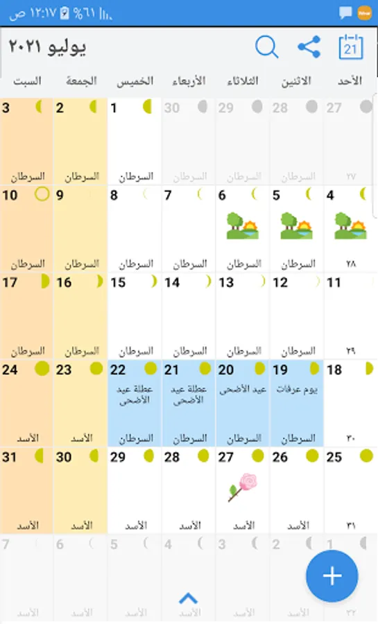 The calendar is available in English and Arabic depending on the phone locale. Week Number and Moon Phases are also available. You may enable/ disable these in the "Settings".