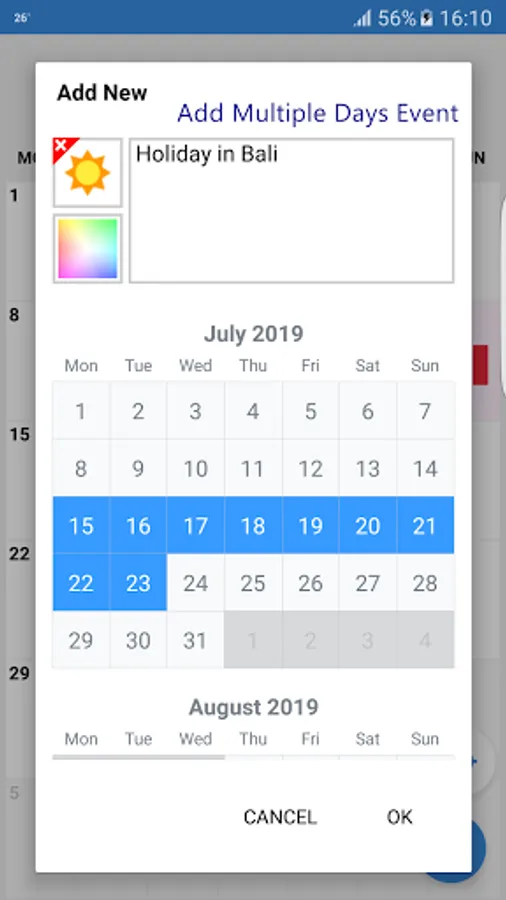 Add individuality to the calendar with colors and icons. You may set the background and font color of your choice. Make it colorful to brighten up your day.