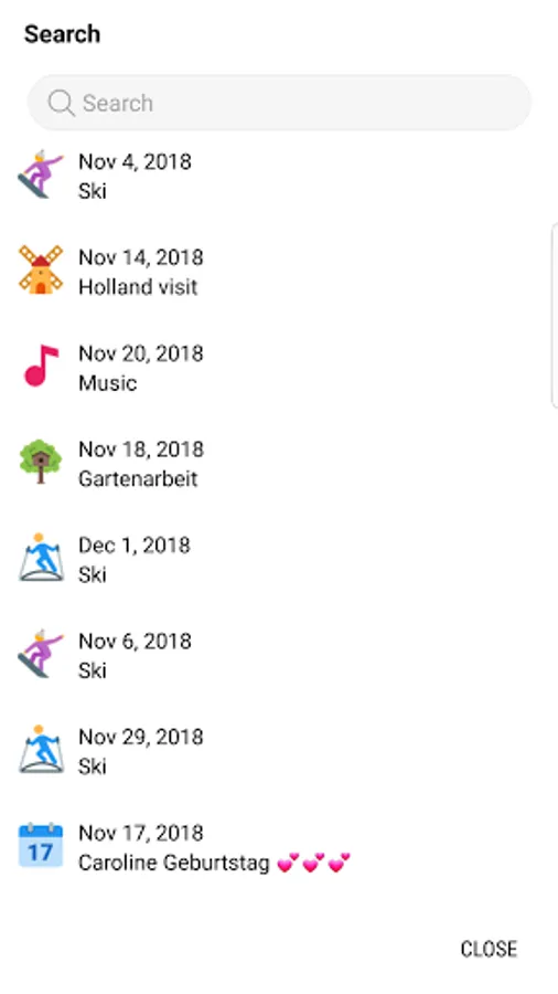 - Search feature. Able to filter search results by birthdays, events or tasks. It is also possible to filter by year range.