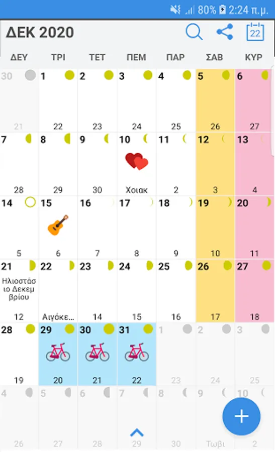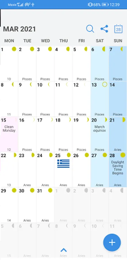 The calendar is available in Greek if the phone is set to Greek locale. English version is also available. Moon Phases are available. You may enable/ disable these in the "Settings".