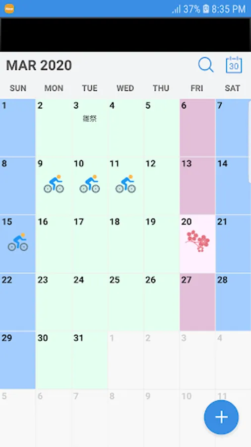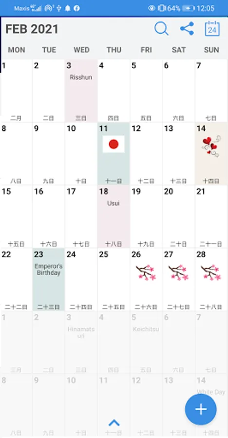 The calendar is available in Japanese and English depending on the phone locale. Week Number, 24 Solar Terms and Moon Phases are also available. You may enable/ disable these in the "Settings" and "Event Filters".