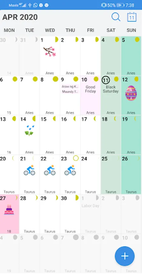 Week Number, Zodiac and Moon Phases are also available. You may enable/ disable these in the "Settings" and "Event Filters".