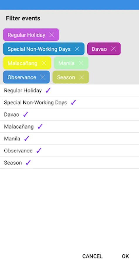 It is possible to show only relevant events, such as National Holiday or Observances. It is also possible to set notifications of events. You may easily find the events by searching using keywords.