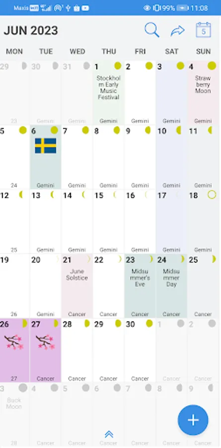 The calendar is available in English and Swedish depending on the phone locale. German, French, Spanish, Polish, Portuguese, Korean and Chinese UI translations are available as well. Week Number and Moon Phases are also available. You may enable/ disable these in the "Settings".