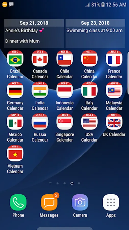 You may also add your own daily, weekly, monthly or annual events. You can use it to track your own diary of events such as planning your vacation, sports events or your friends and families' birthdays. The events are tagged with colorful icons for easy reference. It is simple to create the events. You may create events within a short duration as well, by specifying the start and end dates of the event.