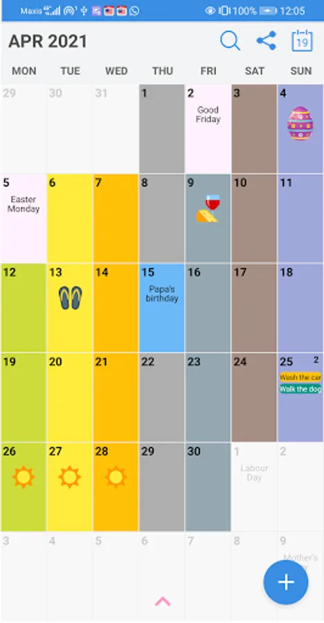 Add individuality to the calendar with colors and icons. You may set the background and font color of your choice. Make it colorful to brighten up your day.