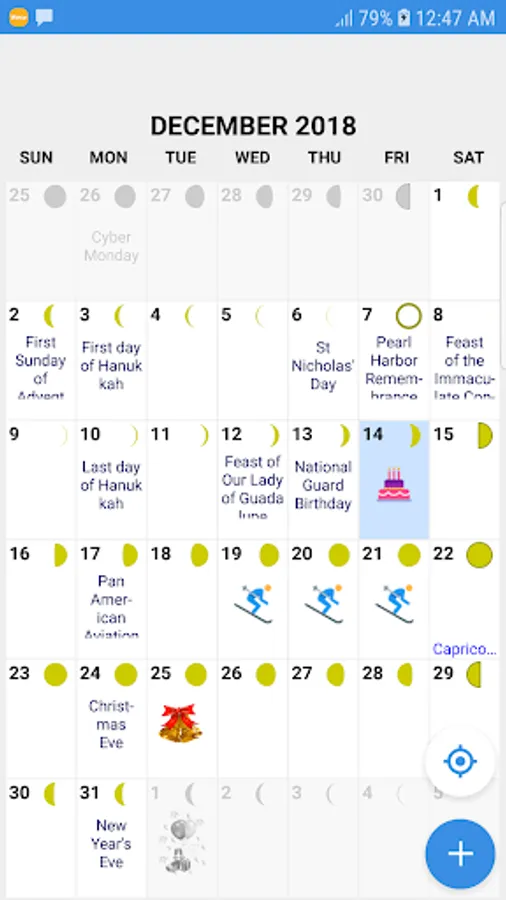 The calendar is available in English and Spanish depending on the phone locale. Korean and Chinese UI translations are available as well. Week Number and Moon Phases are also available. You may enable/ disable these in the "Settings".