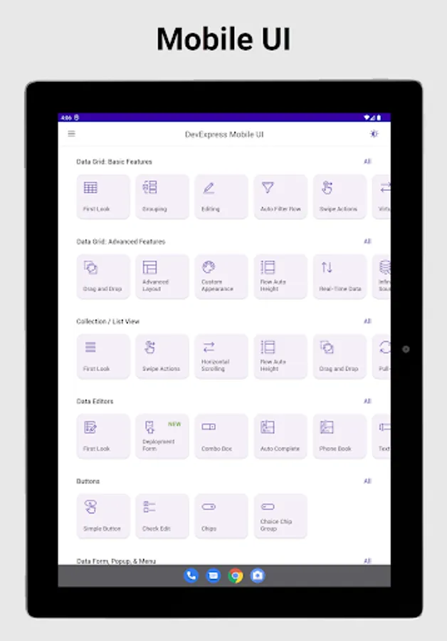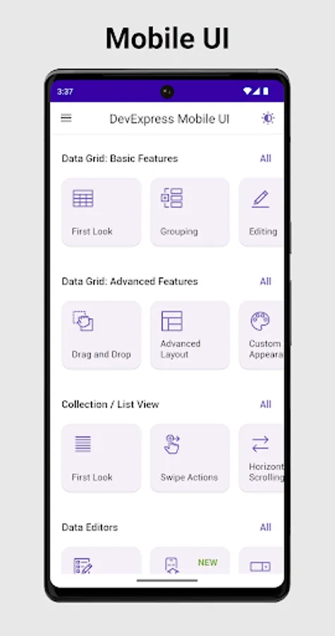 Our FREE DevExpress Mobile UI for .NET MAUI suite includes the Data Grid, Collection/List View, Data Editors, Popup Dialog, Data Form, Tab View, Charts, and Scheduler controls that help you to easily visualize and shape data in your next cross-platform smartphone or tablet application. All controls were built from native Android elements to ensure optimal application performance. While the two predefined themes allow you to switch between dark and light modes, you can also customize each control's appearance as required.