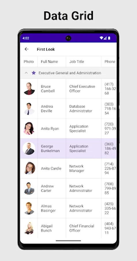Our Mobile UI suite ships with a high-impact and feature-complete Data Grid View. Features include: