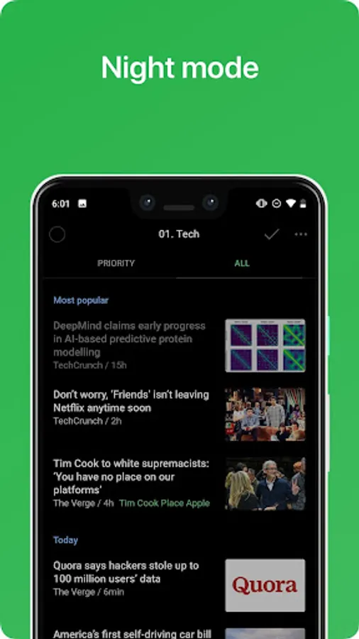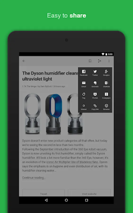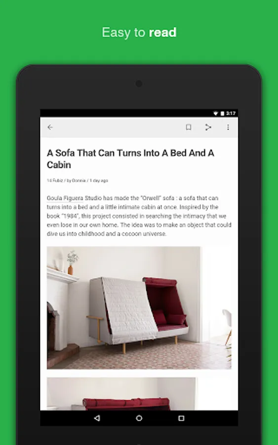 We believe in speed and simplicity. We spent a lot of time making sure Feedly is the best free reader available on the Android phones and tablets. The app loads fast and offers a simple and clean reading experience.