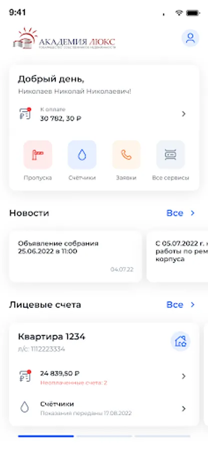 Mobile application for residents and owners of the premises of the residential complex "Academy Lux". An easy way to order passes, automatically recognize and transmit water meter readings, view accruals on personal accounts, contact the dispatcher and the TSN office.
