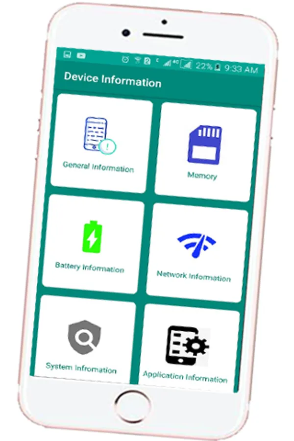 - System information : device brand & model, screen resolution, RAM, storage.