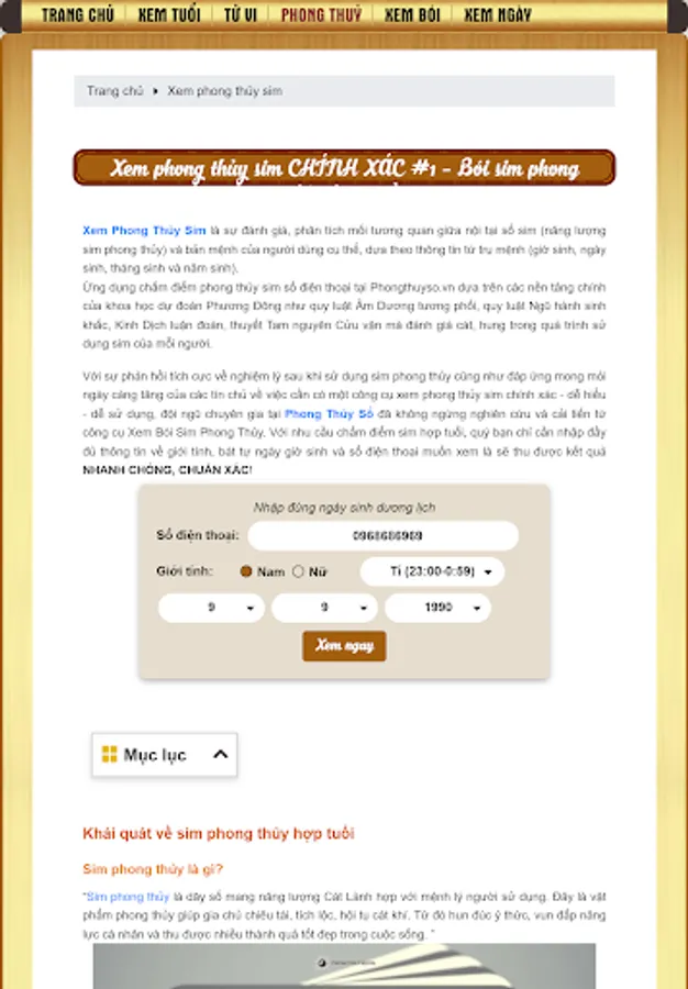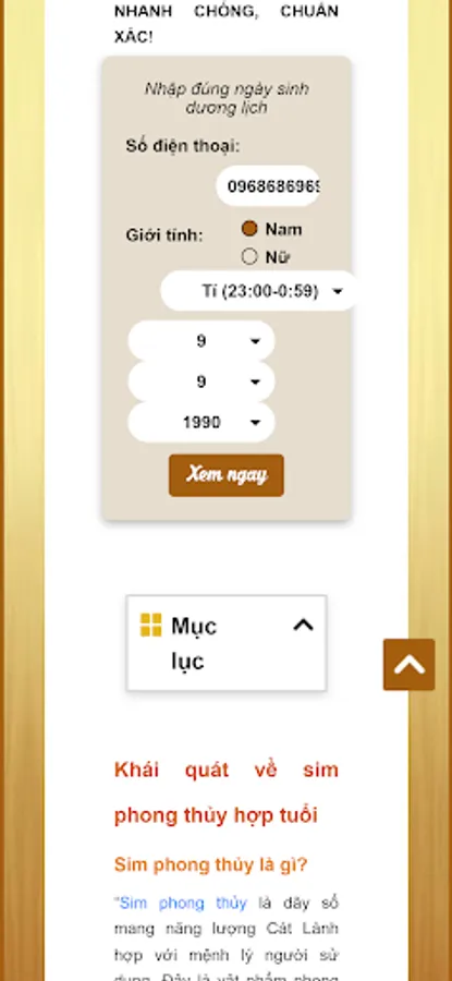 With the positive feedback on the experience after using the feng shui sim as well as meeting the growing expectations of the faithful about the need for an accurate feng shui sim viewer - easy to understand - easy to use, The team of experts at Numerology Feng Shui have constantly researched and improved from the Feng Shui Sim fortune-telling tool. With the need to score sims with age, you just need to enter all information about gender, date of birth and phone number you want to see, and you will get FAST, CORRECT results!