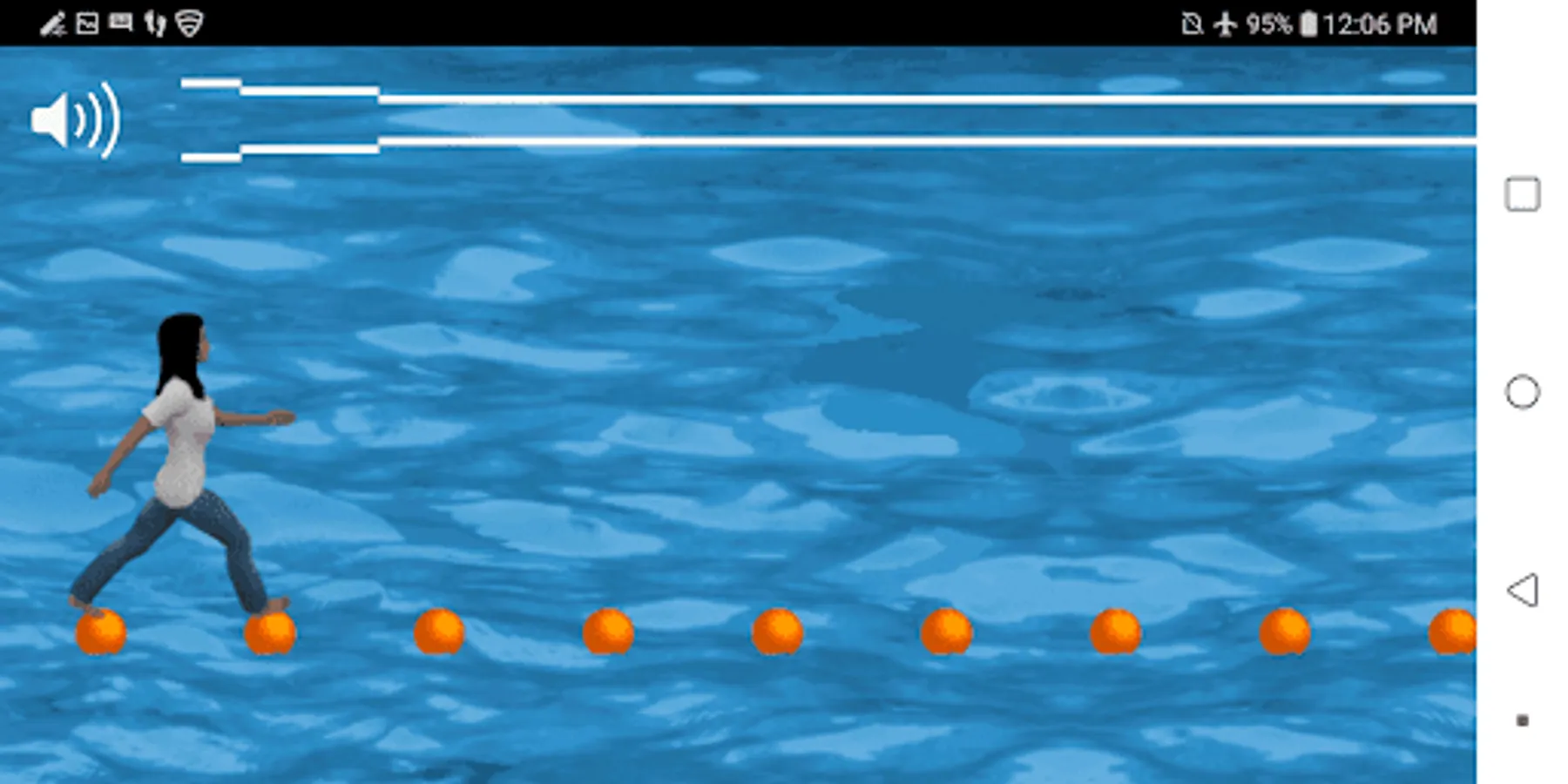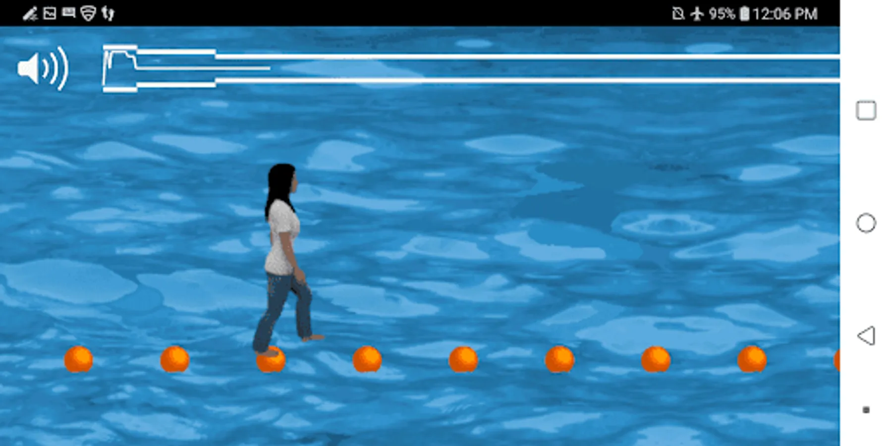 Fitness game. You can exercise, and stay healthy while playing this game. Try to walk to the rhythm of the music to avoid falling on the water. You can enjoy this free game while walking. Have fun with this simulated water adventure :) Magic trick: walk on water to the rhythm of the music :) You can also control the avatar by moving or shaking your phone, or by tapping anywhere. Music: ’Midnight Run’ by TeknoAXE (teknoaxe.com). Attribution 4.0 International (CC BY 4.0). https://creativecommons.org/licenses/by/4.0/ Warning: while you are using this app, please be aware of your surroundings, and use it and/or enjoy and/or play and/or behave and/or communicate safely. For example, if you perform any activity (walking, cycling, running, any interaction with any device or people, and/or any other) while looking at a screen of your device, you must pay attention to your surroundings and you must exercise due care and you must be careful to avoid any collision, fall, accident, or any other. Enjoy responsibly. http://www.device-context.com/terms.html