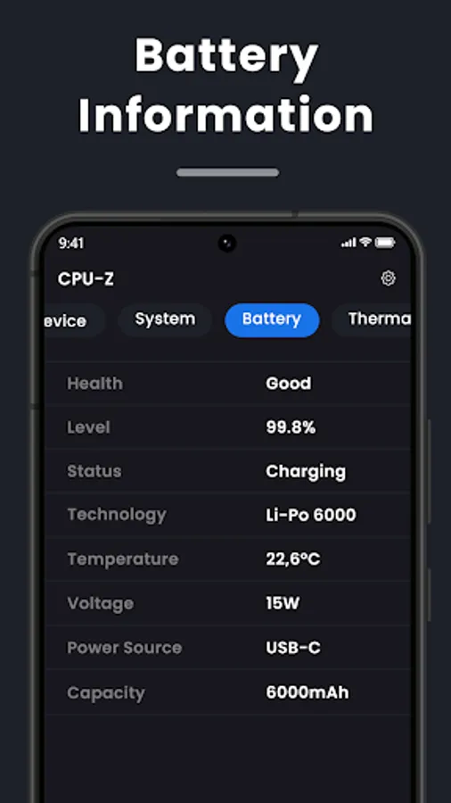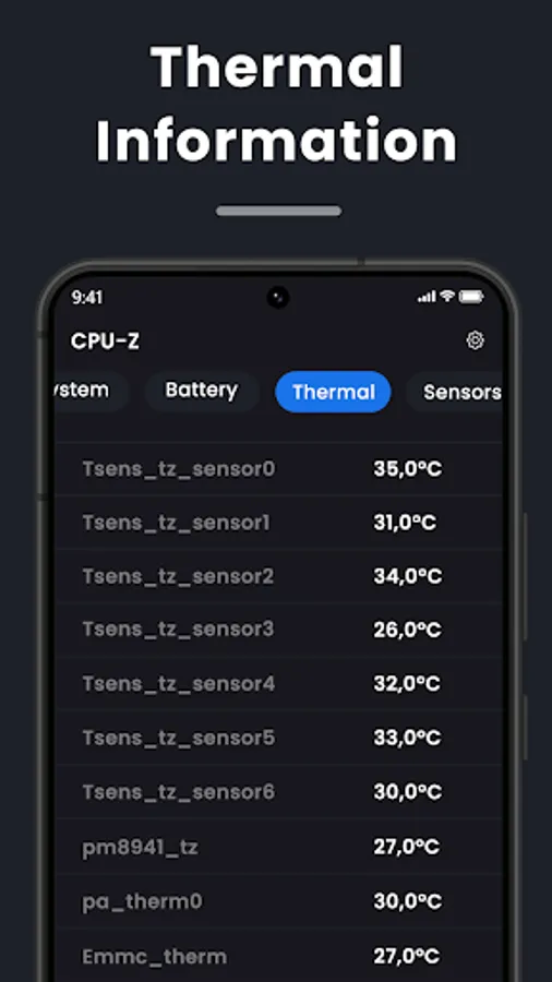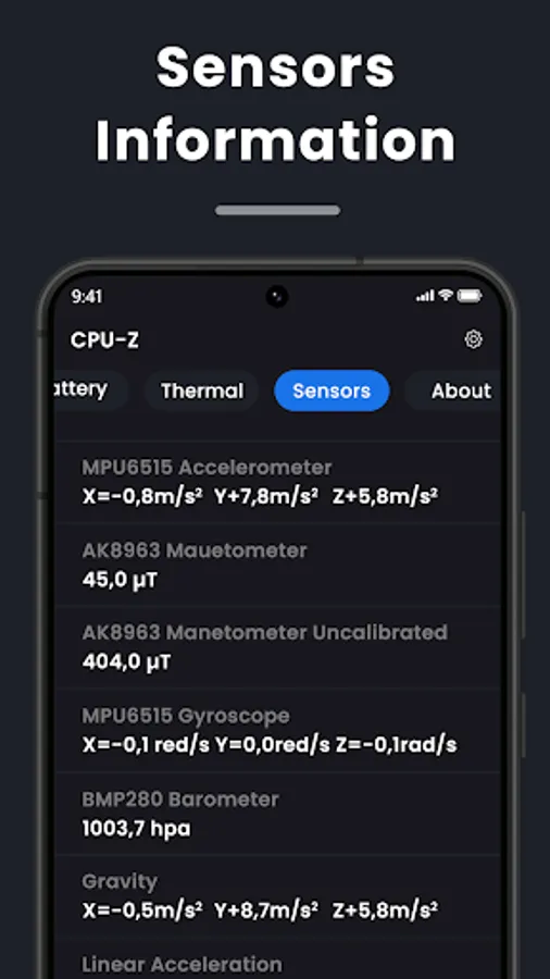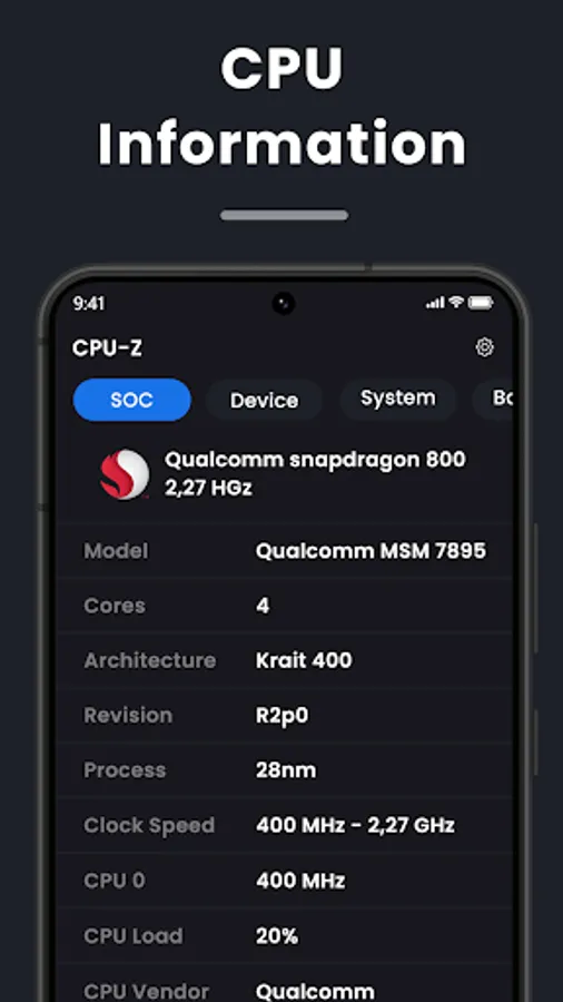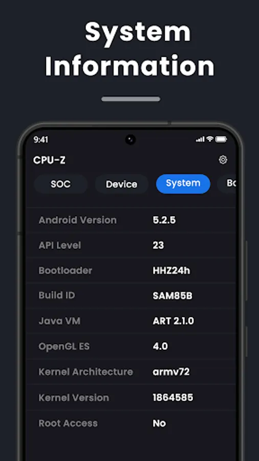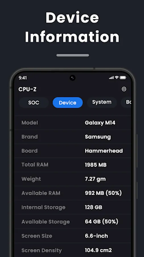 With "Device Specifications" - CPU-GPU, you can quickly check your Android phone’s SoC properties, including CPU cores and real-time clock speed. It also offers you a look at general properties like RAM, internal storage (total and available), display, Android version, and battery capacity. Other specifics like sensors, battery temperature, root access, and system uptime are also provided in a very accessible manner.