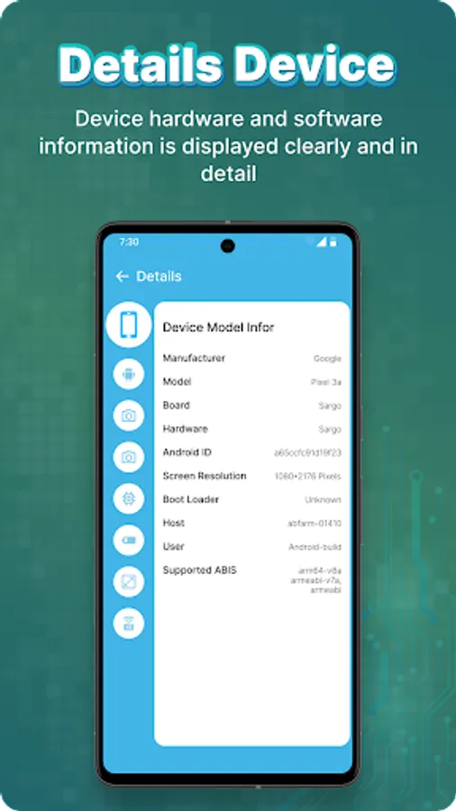 Device: displays all phone info about your SOC, CPU, GPU, memory, storage, Bluetooth and including chip names and manufacturers, architecture, processor cores and configuration, manufacturing process, storage capacity, input devices and display specifications.