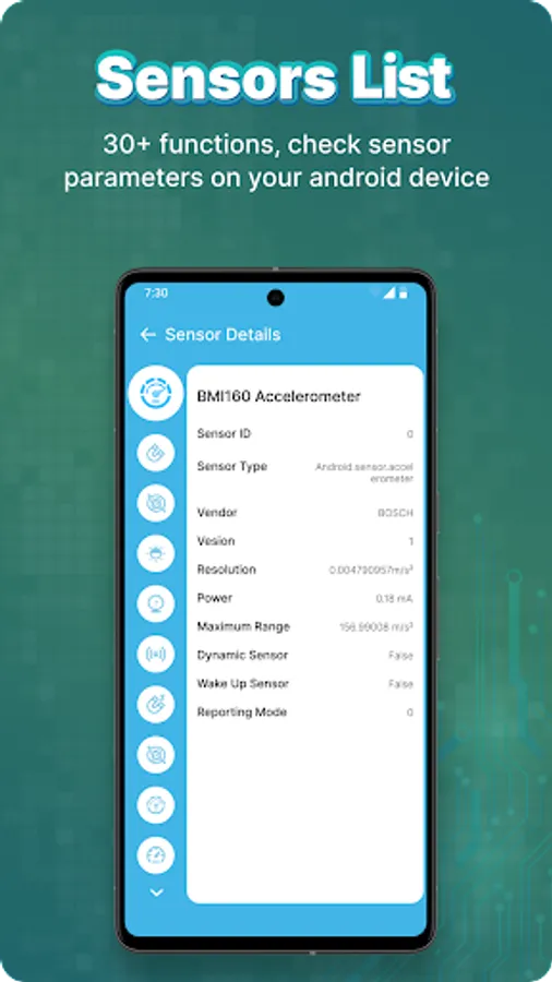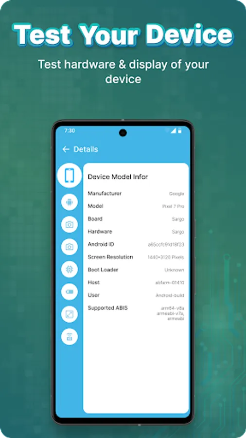 Tests: flashlight, vibrator, buttons, multitouch, display, backlight, charging, speakers, headset, earpiece, microphone and biometric scanners.