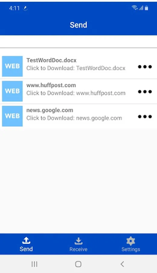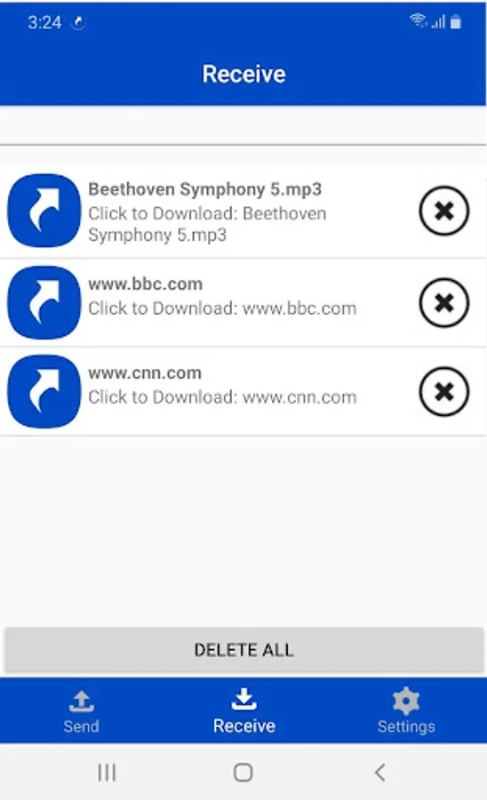 SnapLinx offers several advantages over file or link transfers using direct device-to-device connections, such as iOS AirDrop: a sending smartphone can reach both Android and iOS smartphones with SnapLinx installed, all users of nearby smartphones that receive a notification can immediately and simultaneously download the shared file or link over WiFi or cellular data, or can download the shared file or link for up to 12 hours after receiving a notification, even if they are no longer within the BLE range of the sending smartphone.