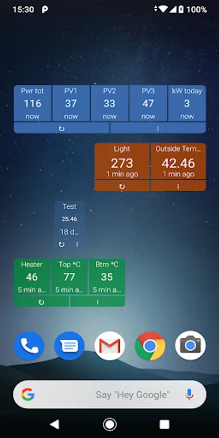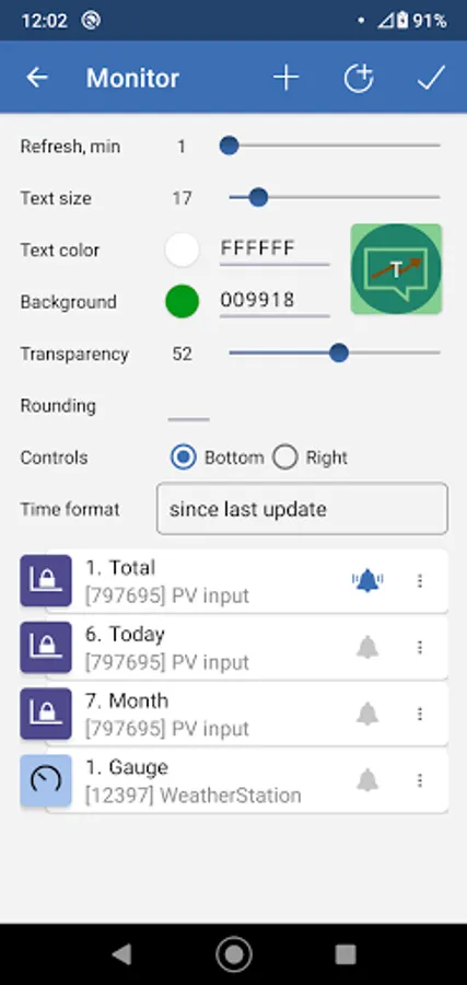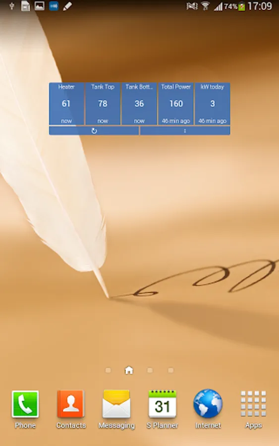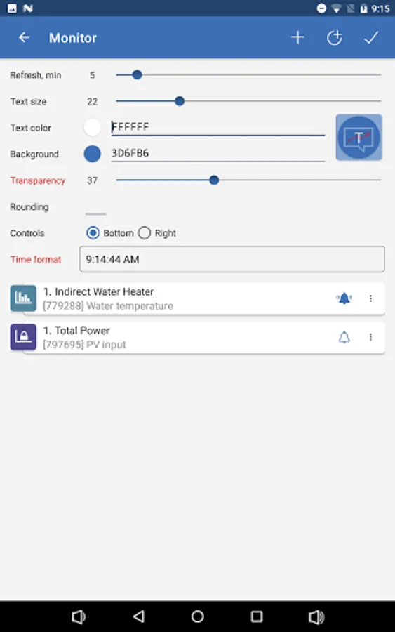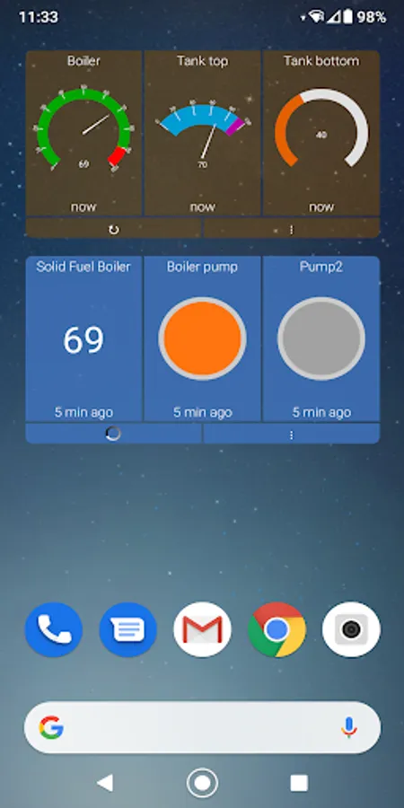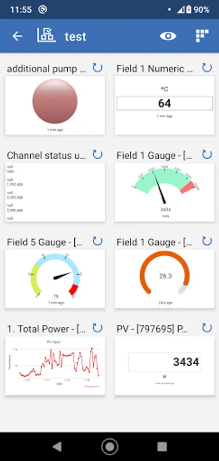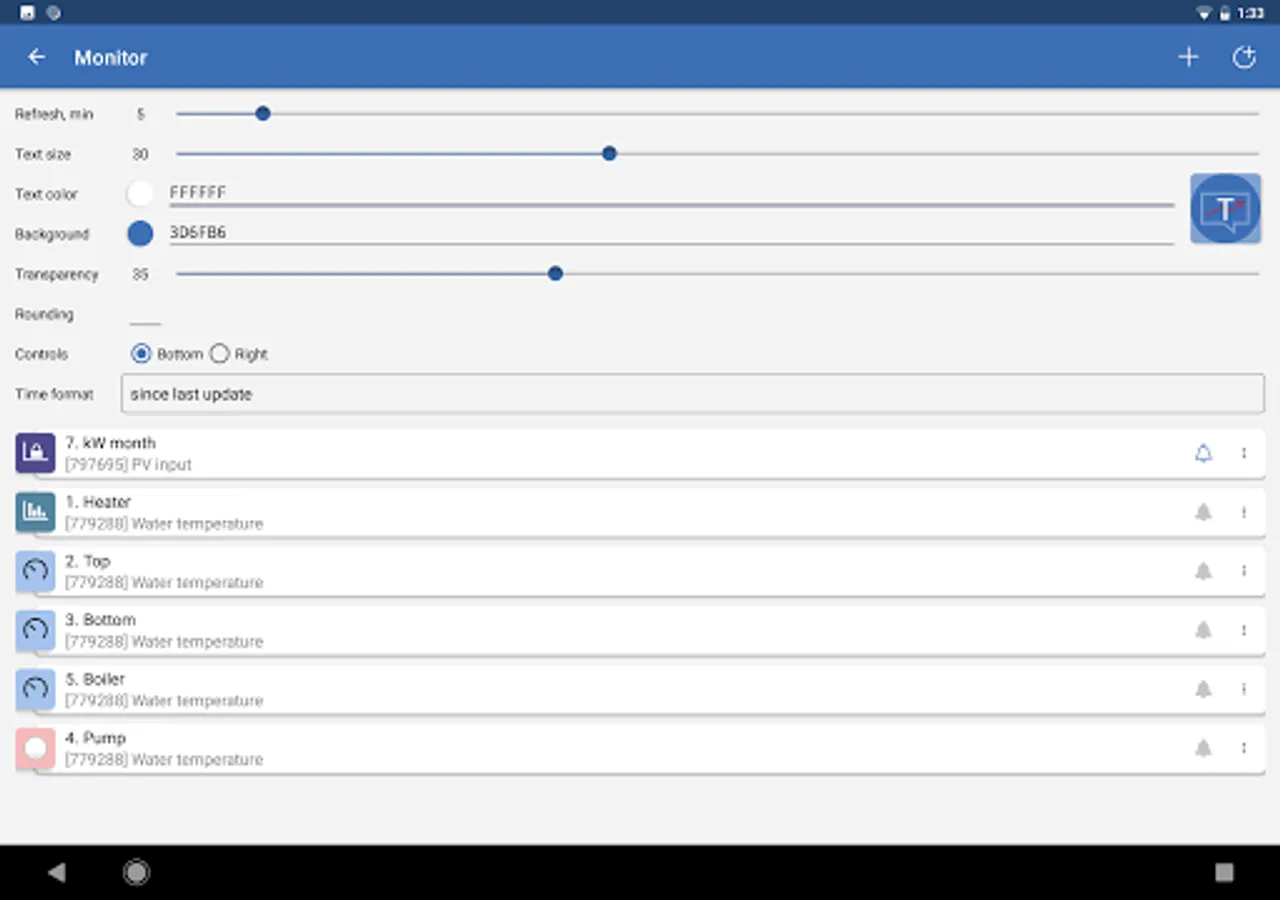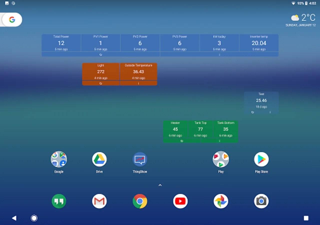 Homescreen widget is very useful part of ThingShow that helps to view channel fields data without launching an application. One homescreen widget can visualize up to 8 fields from different channels showing a gauge, lamp indicator, compass or numeric value. Each field can send notification when value threshold exceeded. To fit into homescreen widget space the field name can be changed locally.
