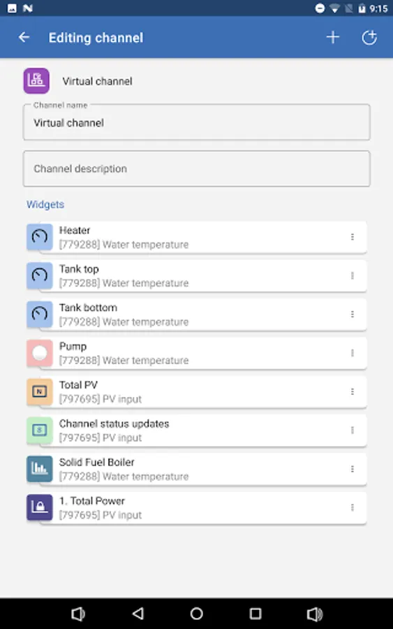 A virtual channel can be created to group different widgets from different channels on one screen. Just give it a name and choose widgets from channels that are already setup in ThingShow. It is also possible to change widgets order within a virtual channel. Local widgets such as Gauge, Lamp Indicator, Numeric Display, Compass or Channel Status Updates can be created on virtual channel using public or private channel's data.