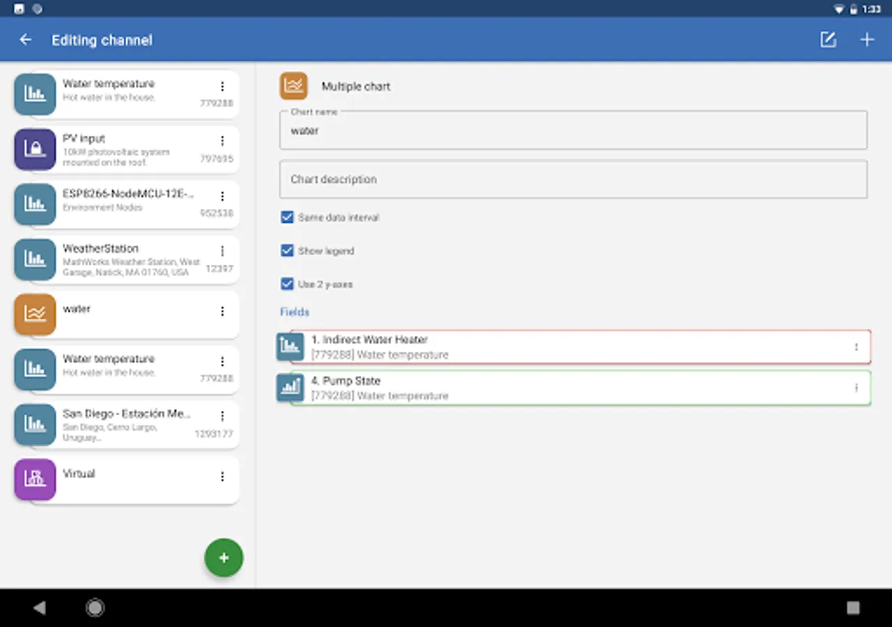 Any chart can be opened on a separate screen in details. Its options can be changed and stored locally including charts that are opened from homescreen widgets. This will not affect data stored on ThingSpeak™ server.