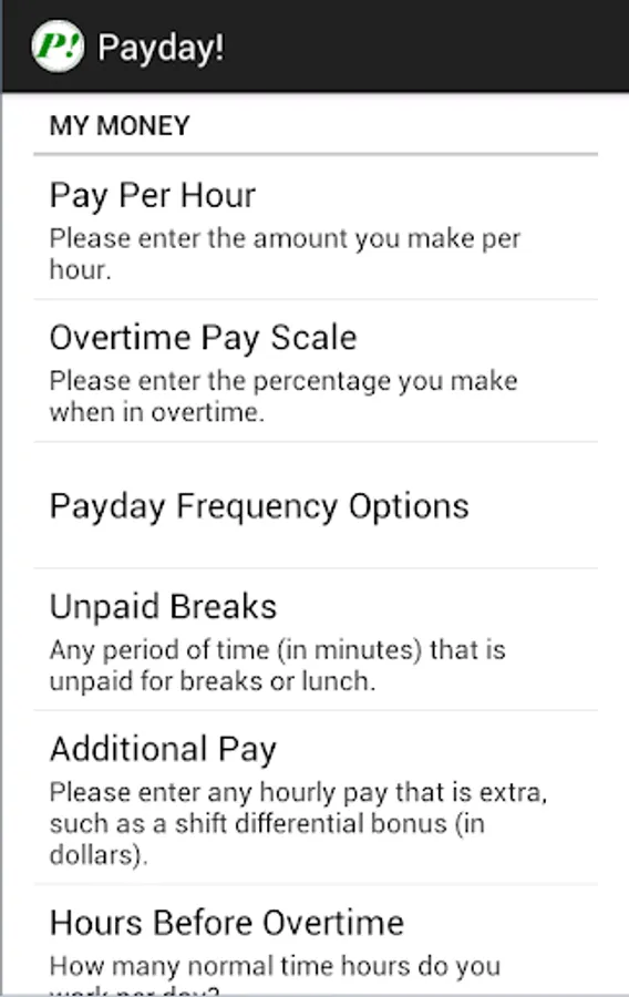 When you first start, the app will direct you to the settings screen. Fill them out, including the three payday frequency options. You can change these options at any time if, for some reason, your payday frequency changes. Ensuring these are all correct before starting will ensure the correct calculations! Weekly overtime is assumed to be 40 hours. The Additional Pay option is for any pay that is not considered for overtime.