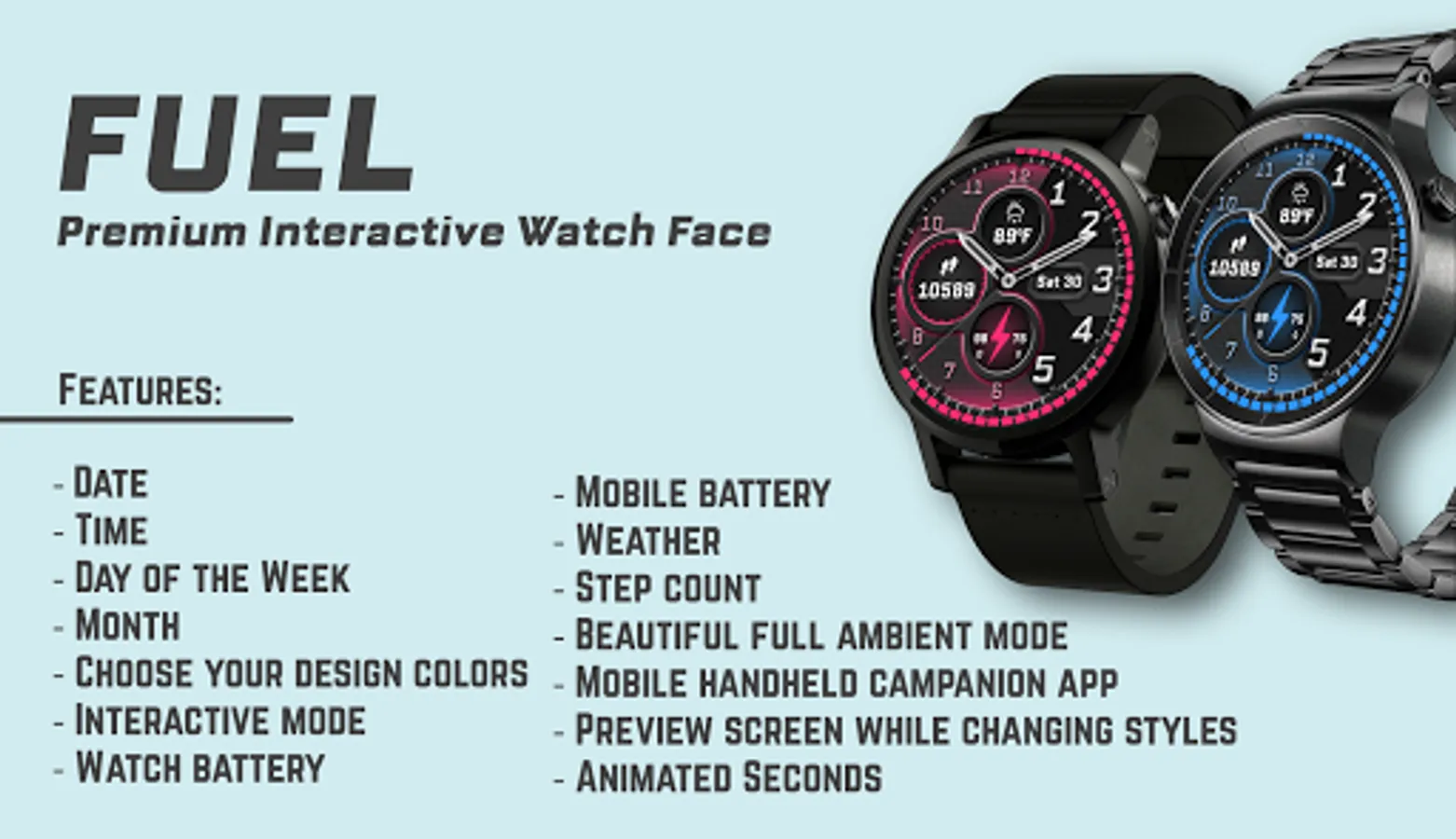 Fuel - perfectly works on all Android Wear devices, get the fast and smooth experience with our watch faces.