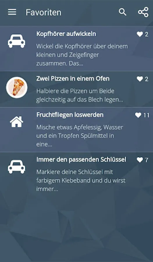 The app contains over 400 tips, tricks and life hacks that amaze everyone. If you like a life hack, you can add it to your favorites or share it with friends.