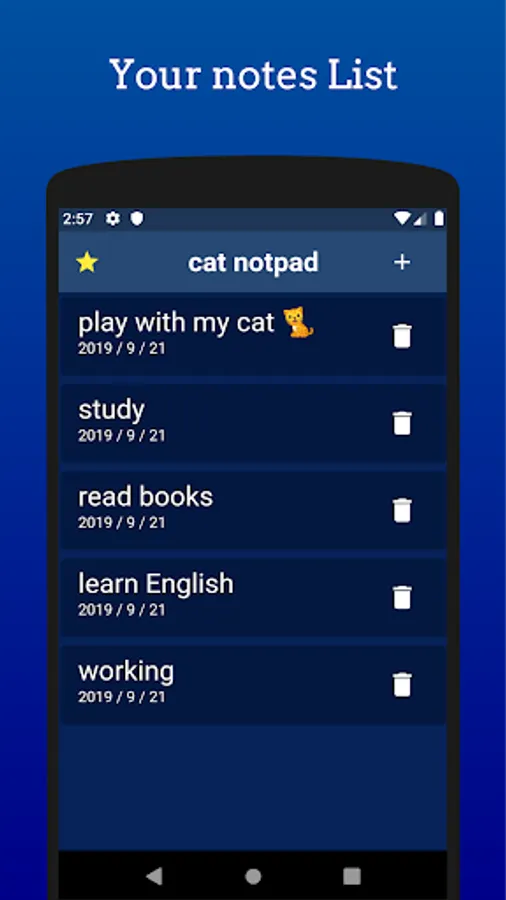 cat notepad is very easy and simple to use just click in button add new note and start to add title and description of your notes and click button add new and you can edit it or deleted if you want
