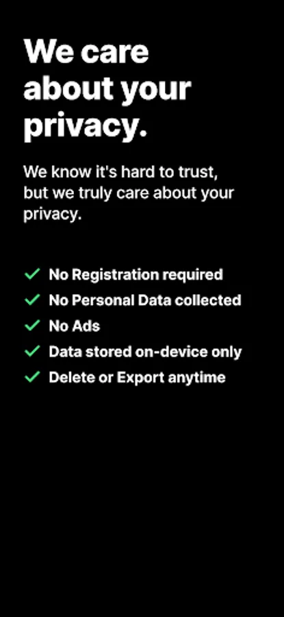 - Privacy: The data is stored on the device only, so you are the only one with access to your data.