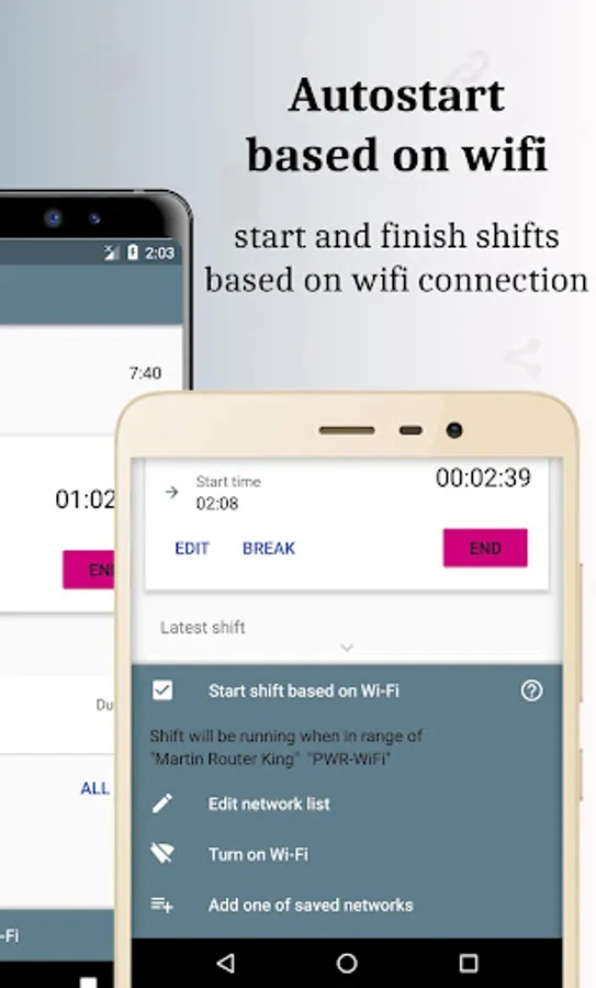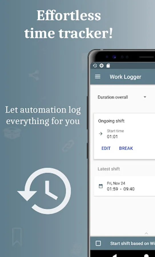 When one of specified Wi-Fi networks will be in range Work Logger will start recording time. Whenever Wi-Fi will be out of range, stop signal will be detected and shift will automatically end.