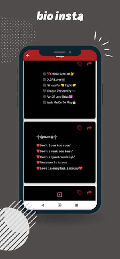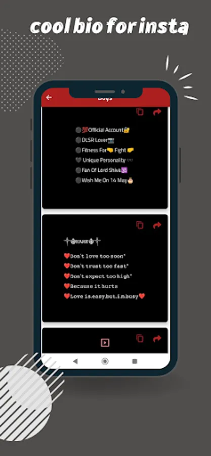 - bio for insta - captions is easy to use, as you can share and copy bios, captions, highlights, and quotes with your friends through social media platforms with ease.