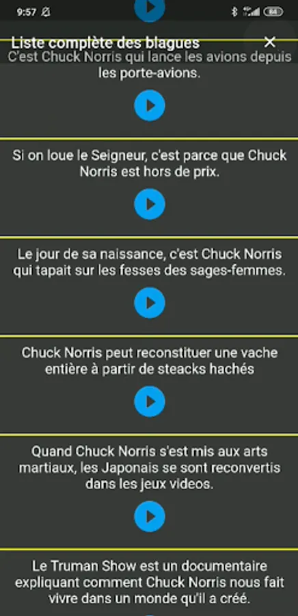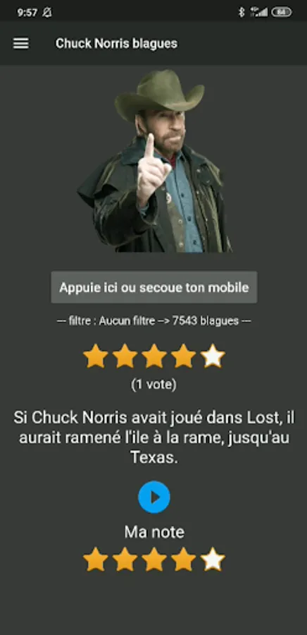 This app provides access to thousands of jokes about Chuck Norris. The jokes are told in a synthetic voice, randomly by pressing a button or shaking your phone.