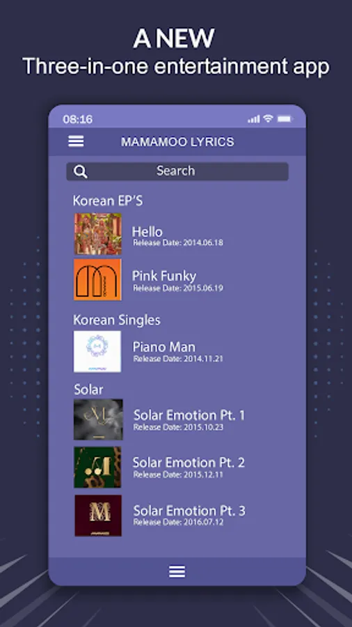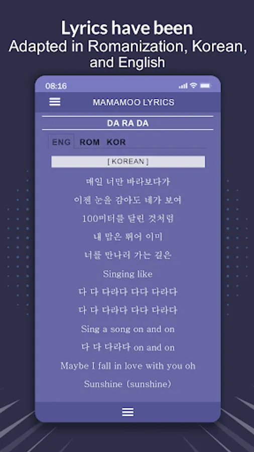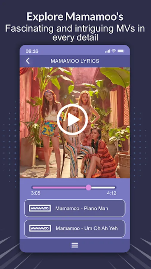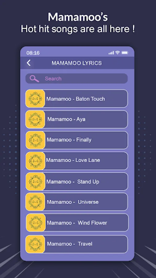 Kpop Songs: Mamamoo All Lyrics is an application that provides lyrics of Mamamoo's hot hits in Romanization, Korean, and English. The lyrics viewer is completely offline. So you can view your favorite lyrics and sing along easily whenever you want.