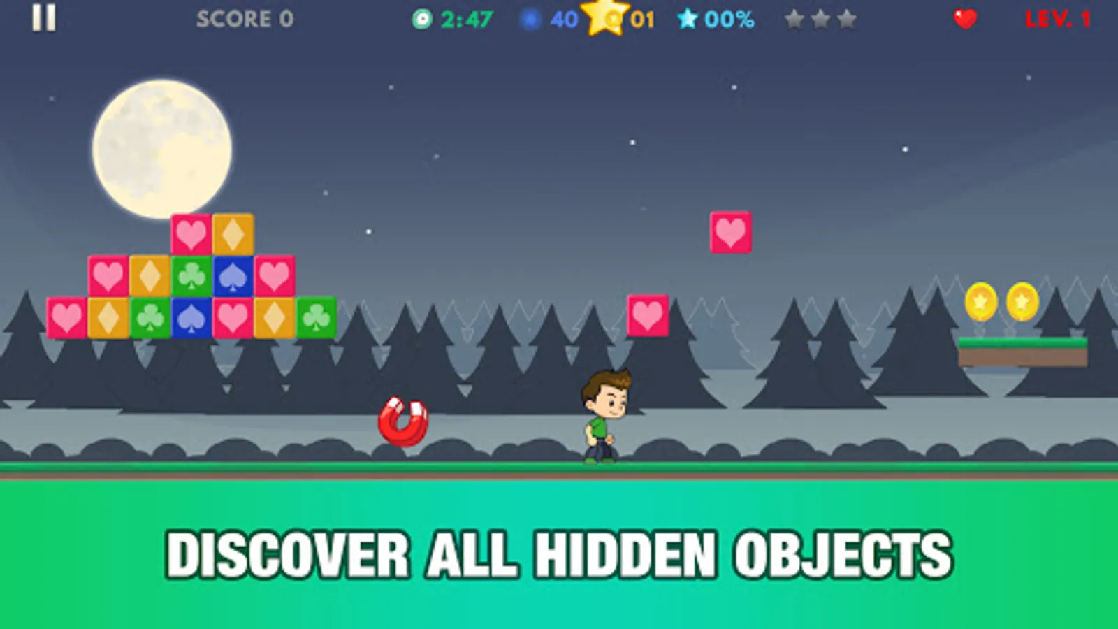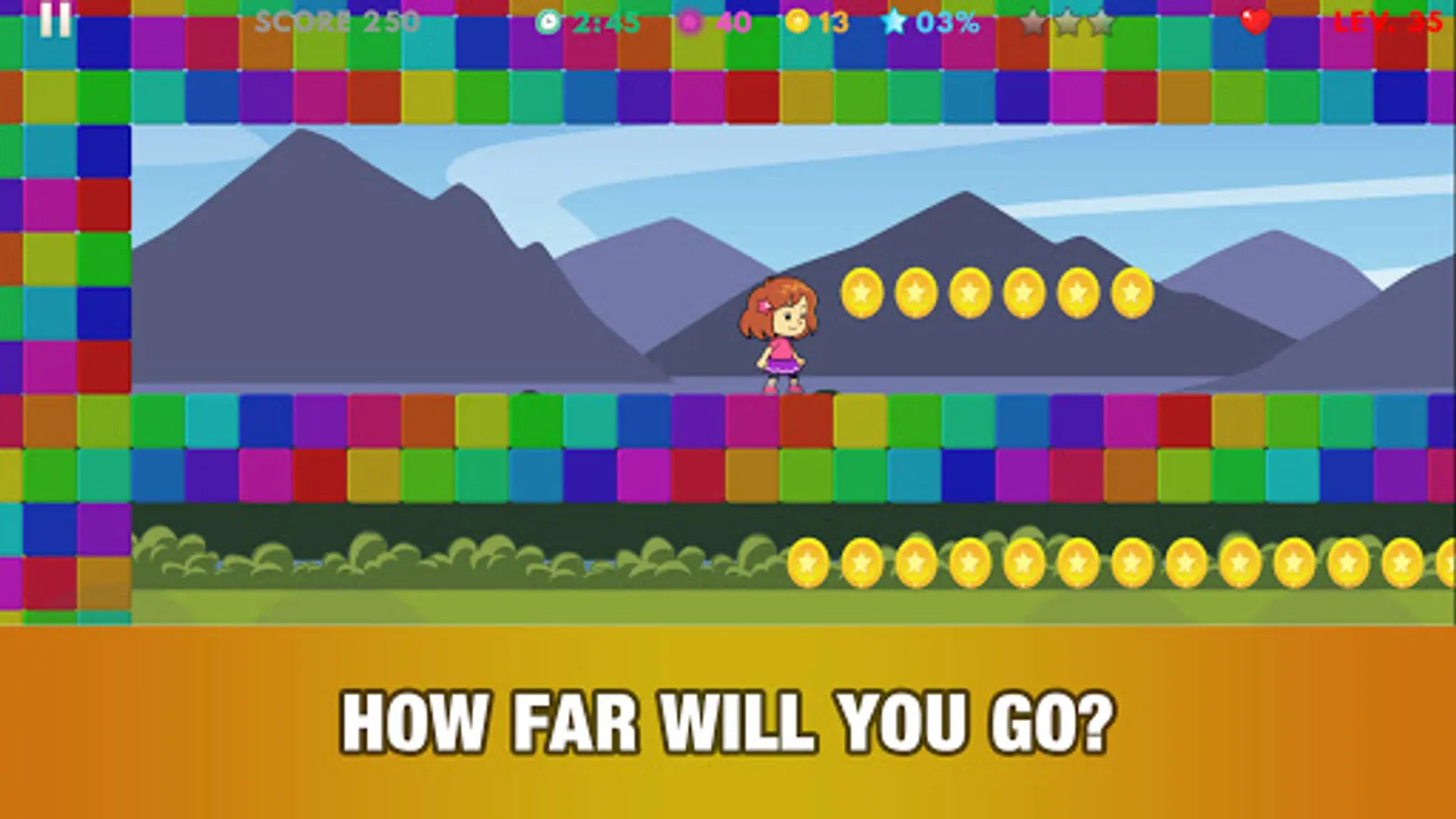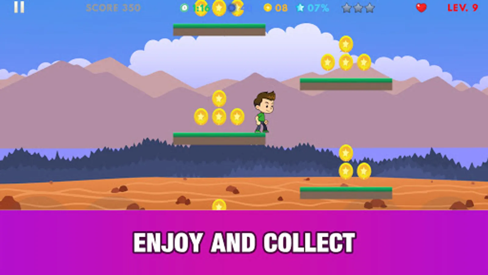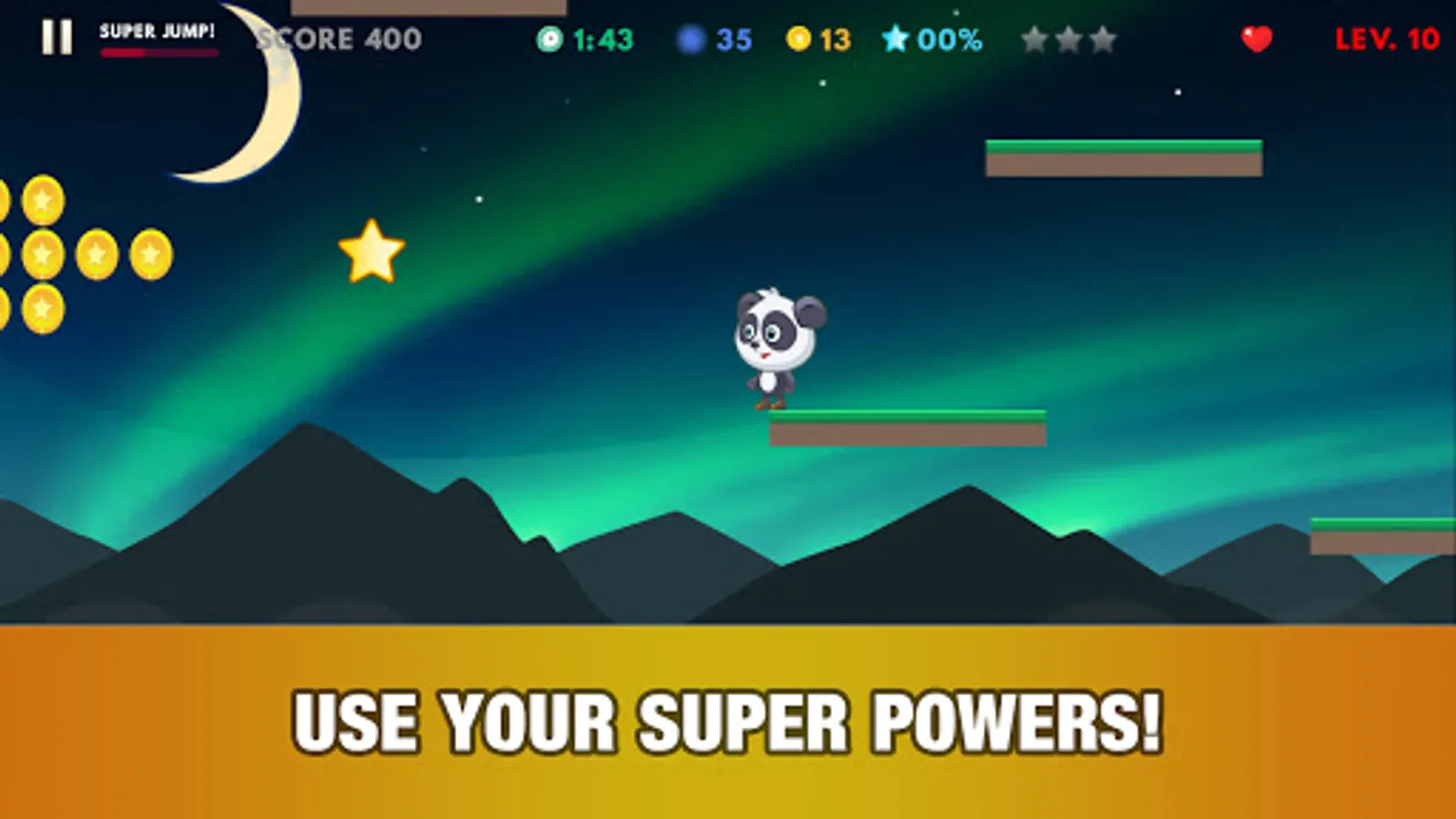 Find and use your super powers: SUPER JUMP, SUPER RUN, LOW GRAVITY and INVINCIBILITY.