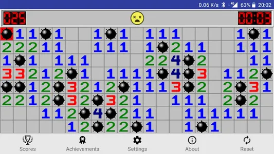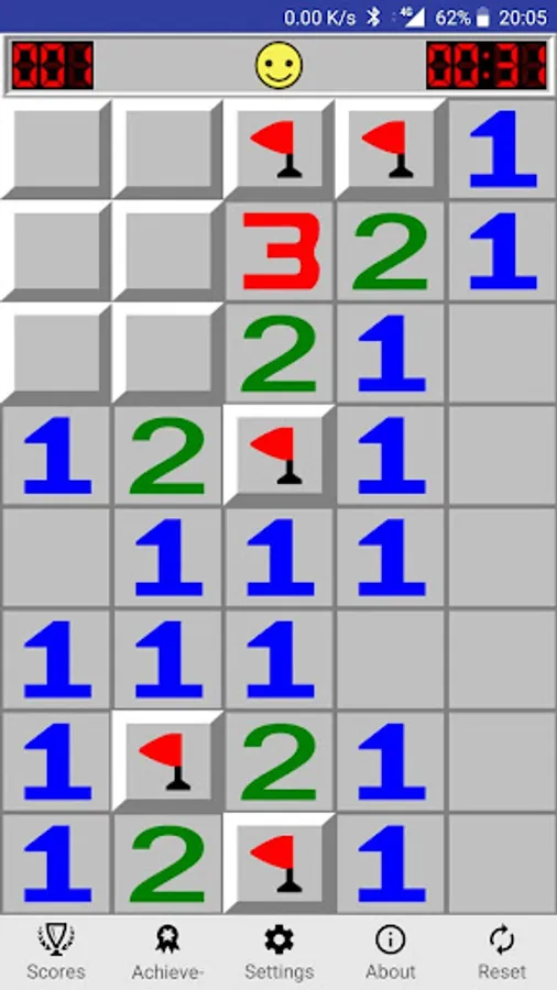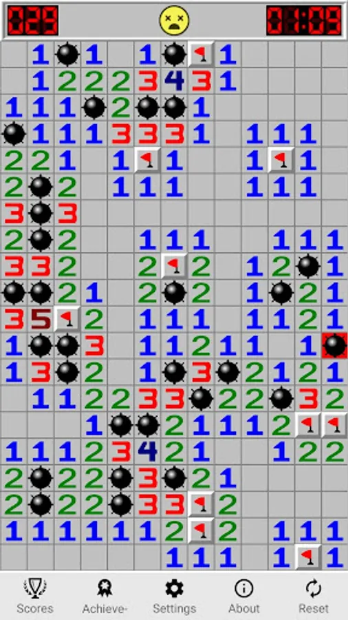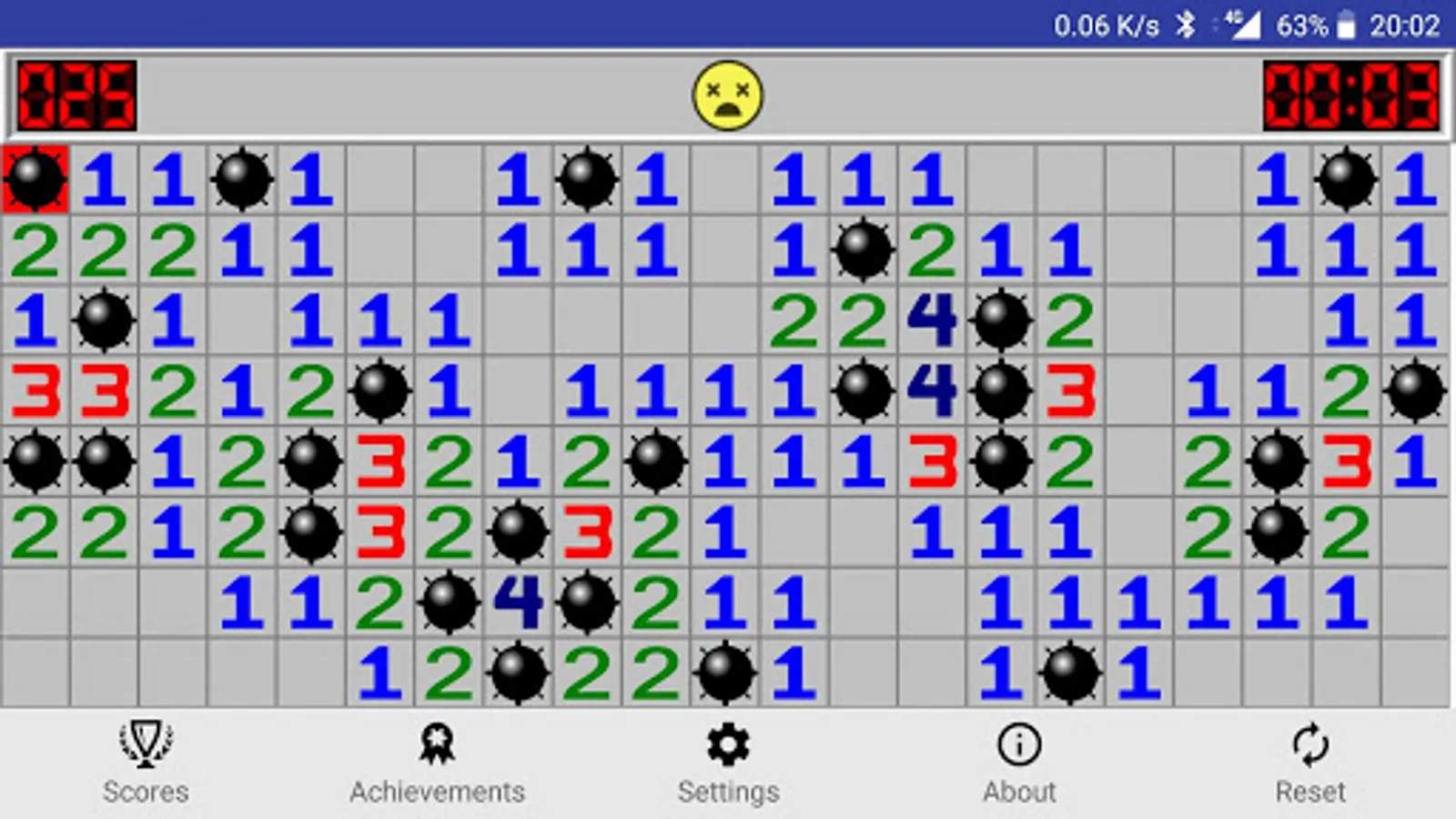 This game originates from the 1960s, and has been written for many computing platforms in use today. The objective of the game is to clear the board containing hidden "mines". Minesweeper starts when a you tap on a cell. The first click is always safe and reveals a number or an opening surrounded by numbers. Each number tells you how many mines touch the cell. You can mark a mine by putting a flag on it with the long tap. If all the mines touching a number are flagged, you can press both buttons on that number to clear the remaining adjacent squares.