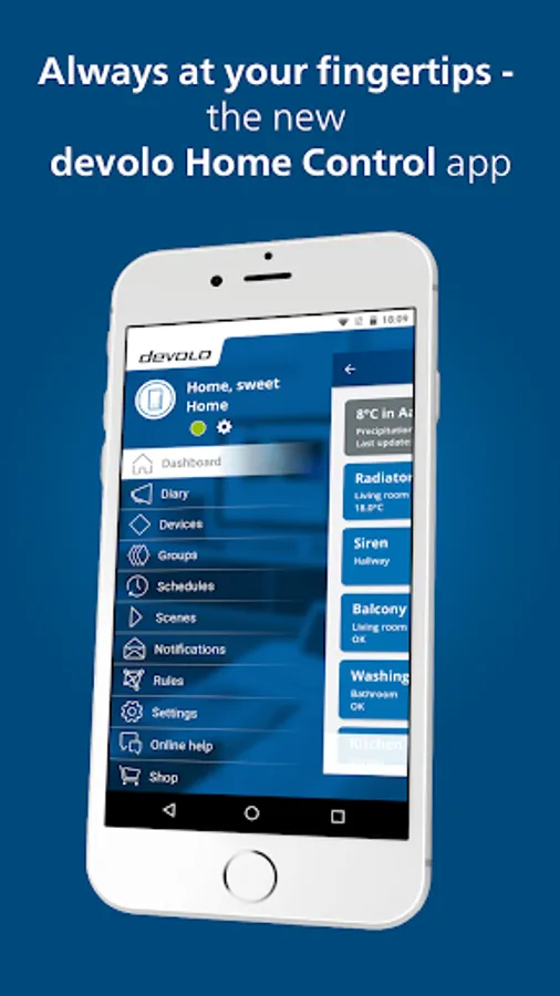 It’s very user-friendly, has smart functions and is so convenient – the new Home Control app lets you conveniently control your Smart Home system in the blink of an eye, no matter where you are. This is made possible by practical and thought-out features, such as initial installation through the app, and controls presented as settings and groups. Statistics and the house diary give information about the condition of the Home Control devices and their activities. And thanks to individual configuration options like the personalised dashboard, the app can always meet your needs. Whatever function you want to perform with the new devolo Home Control app, it’ll be done in just a few steps.