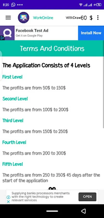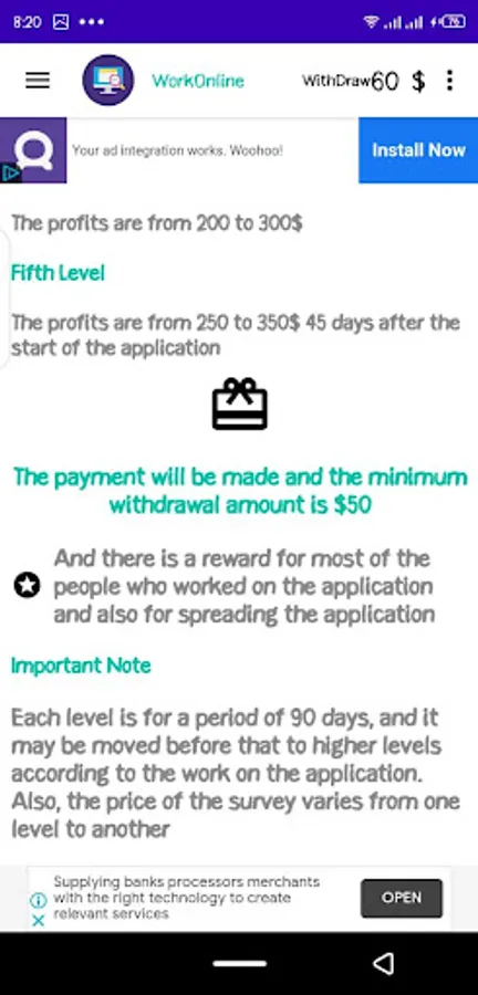 After 45 days of working on the app, funds can be requested, and the payment will be made and the minimum withdrawal amount is $ 50
