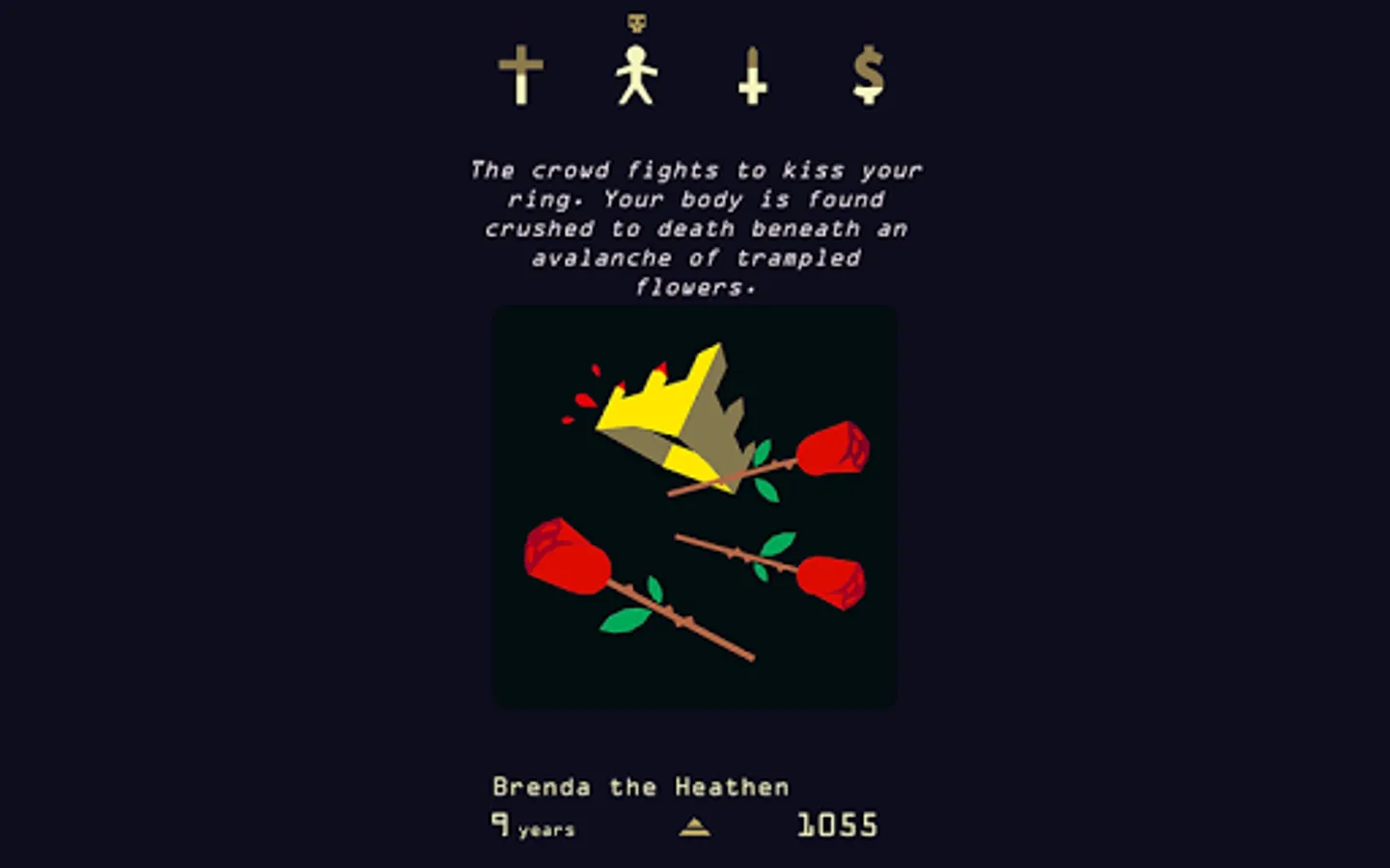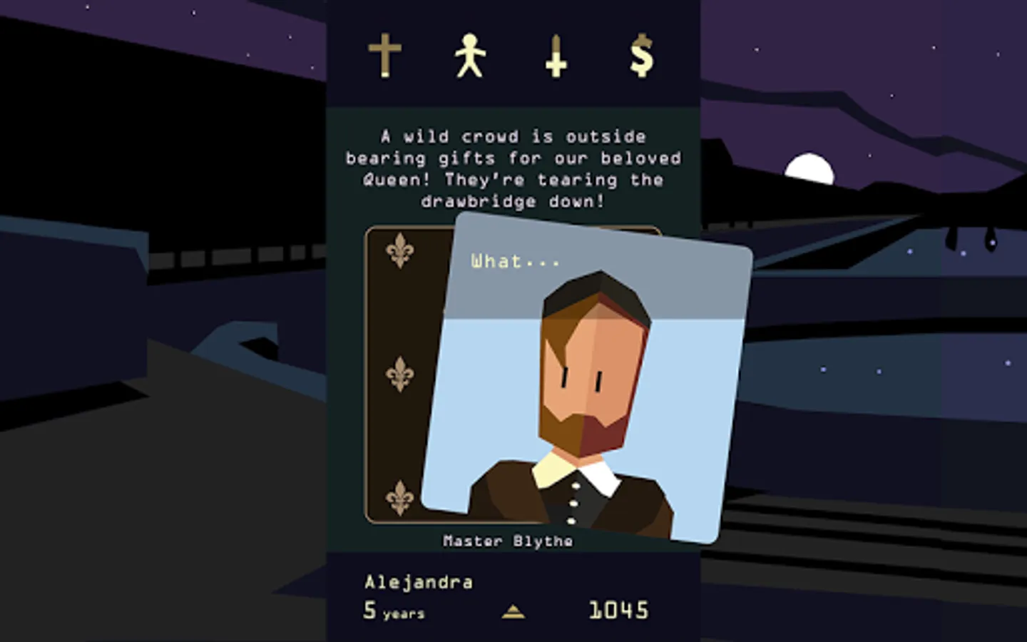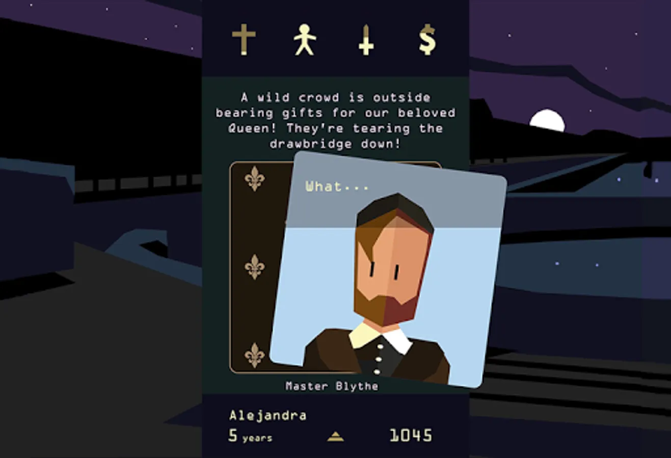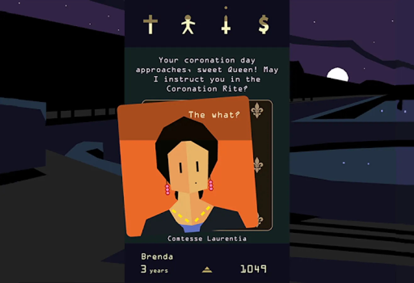 Nerial and Friends: Reigns: Her Majesty is a collaboration between François Alliot (design/programming), Arnaud de Bock (art), Jim Guthrie (music), and Leigh Alexander (narrative director).
