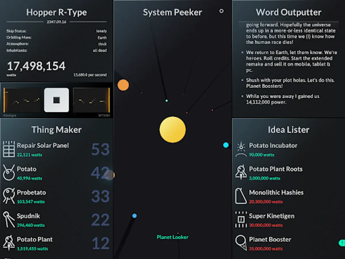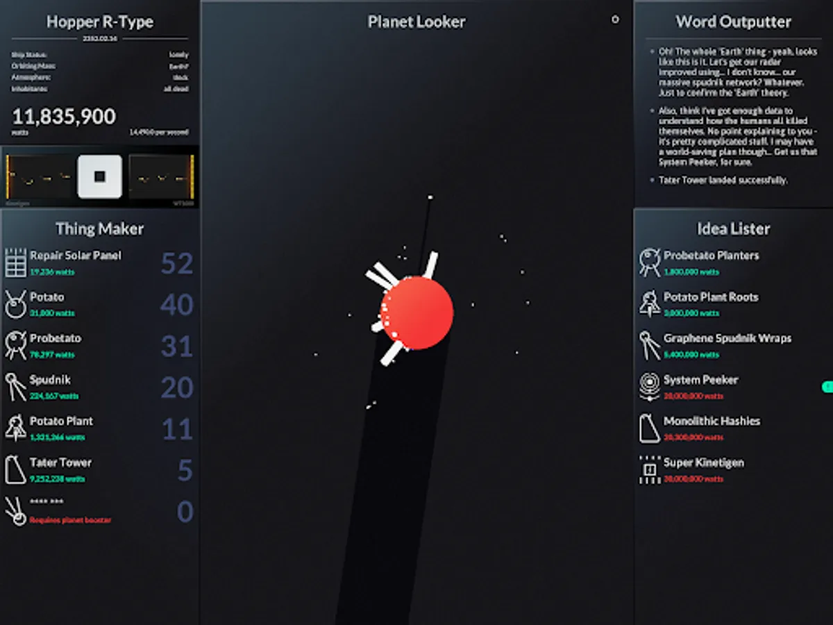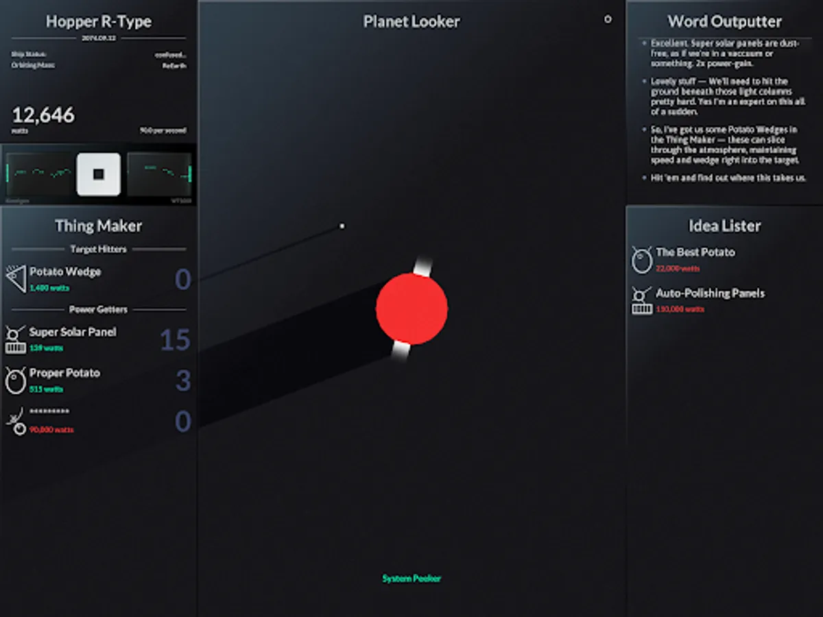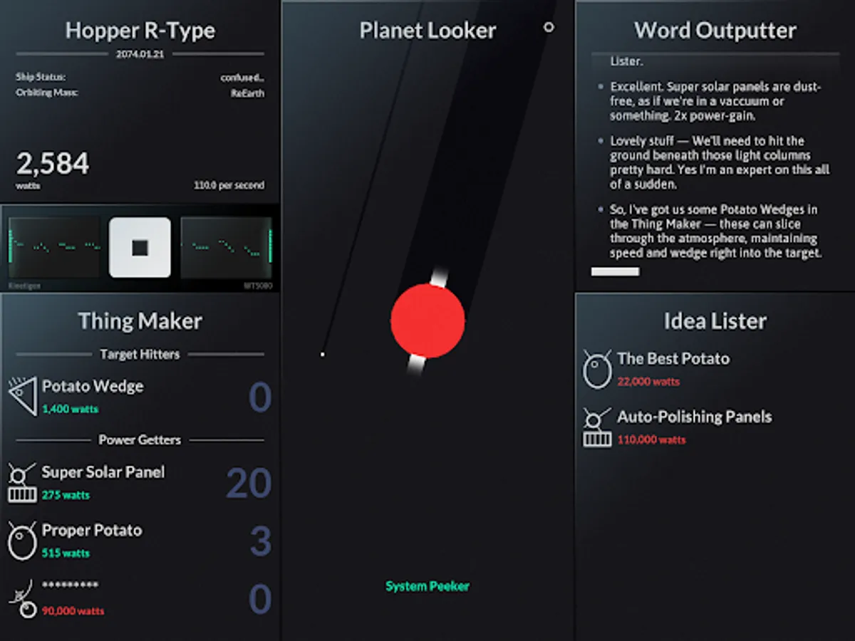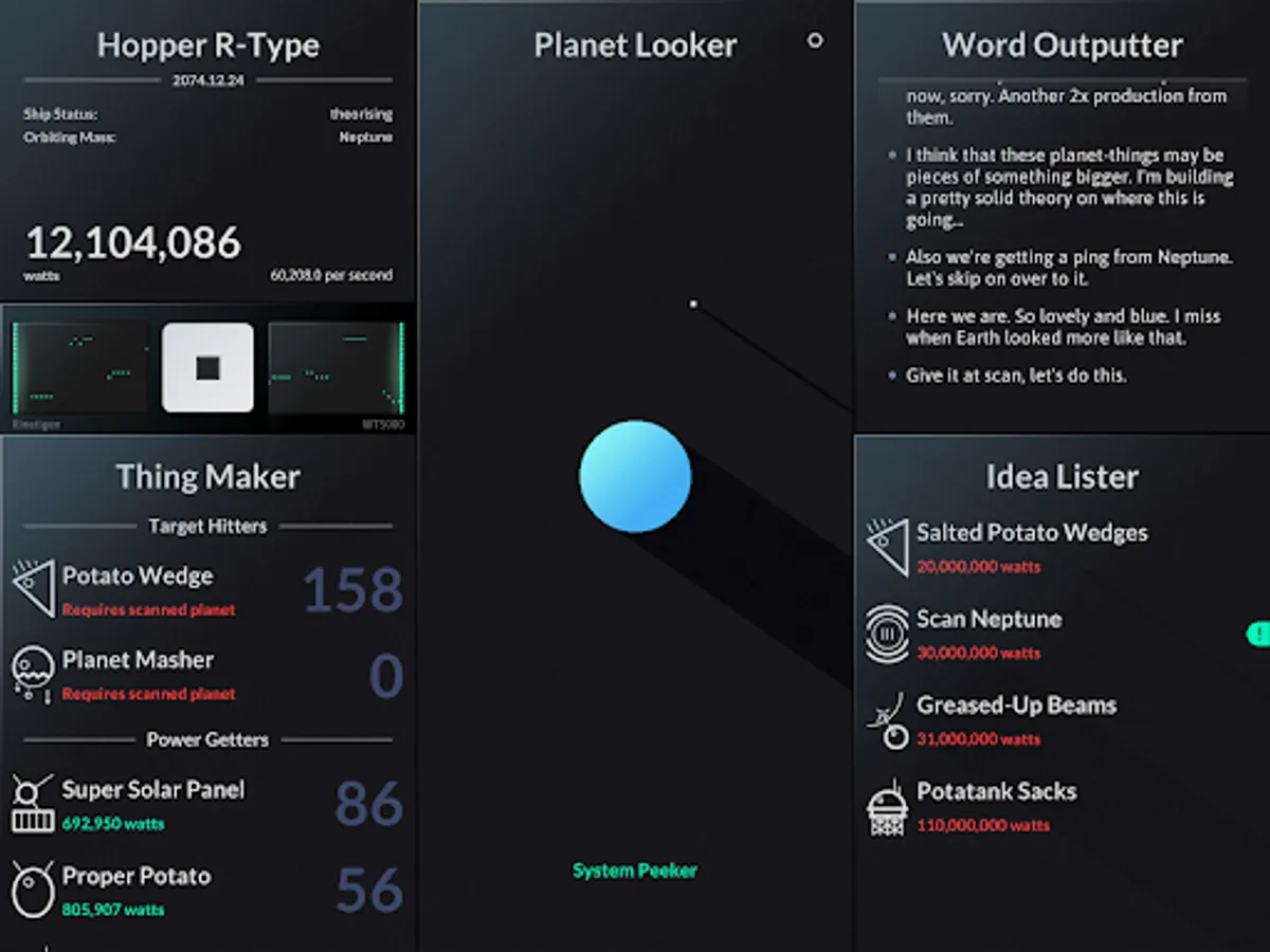 SPACEPLAN is an experimental piece of interaction based partly on a total misunderstanding of Stephen Hawking’s A Brief History of Time. Use manual clicks and the passage of time to create and launch potato-based devices and probes from your nondescript satellite orbiting a mysterious planet. Unlock the mysteries of the galaxy or just kill some time in what the astrophysics community is calling the ‘best narrative sci-fi clicker game of all times’.