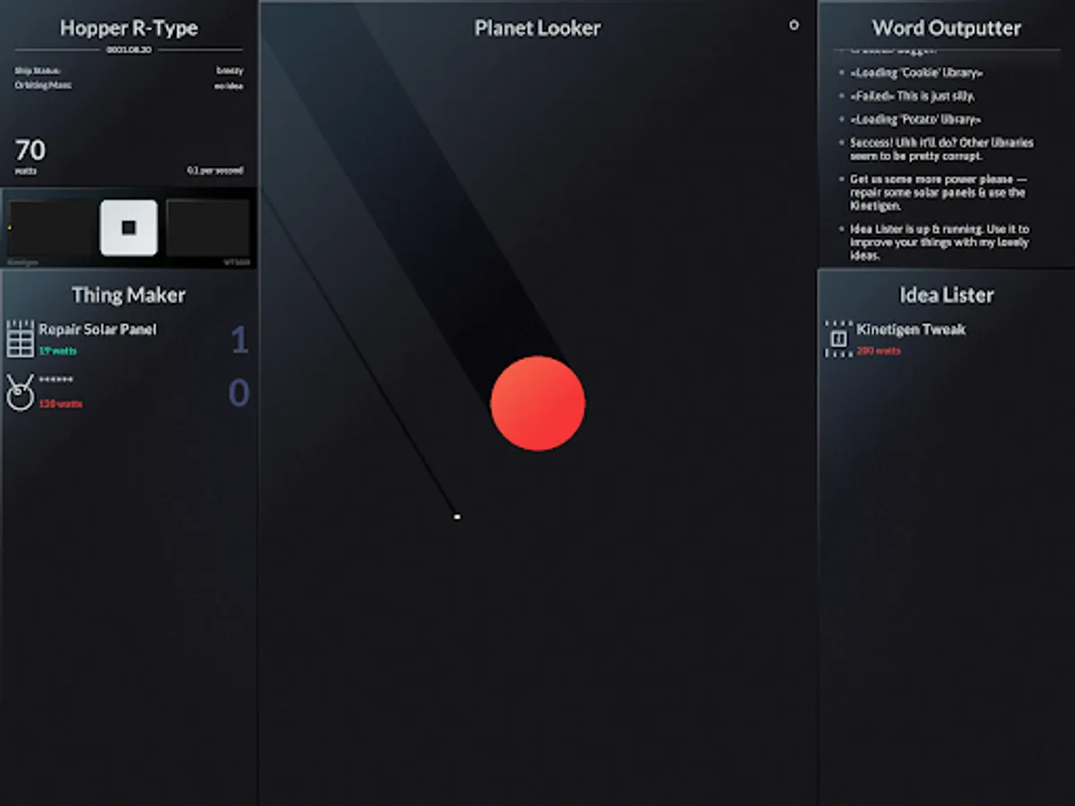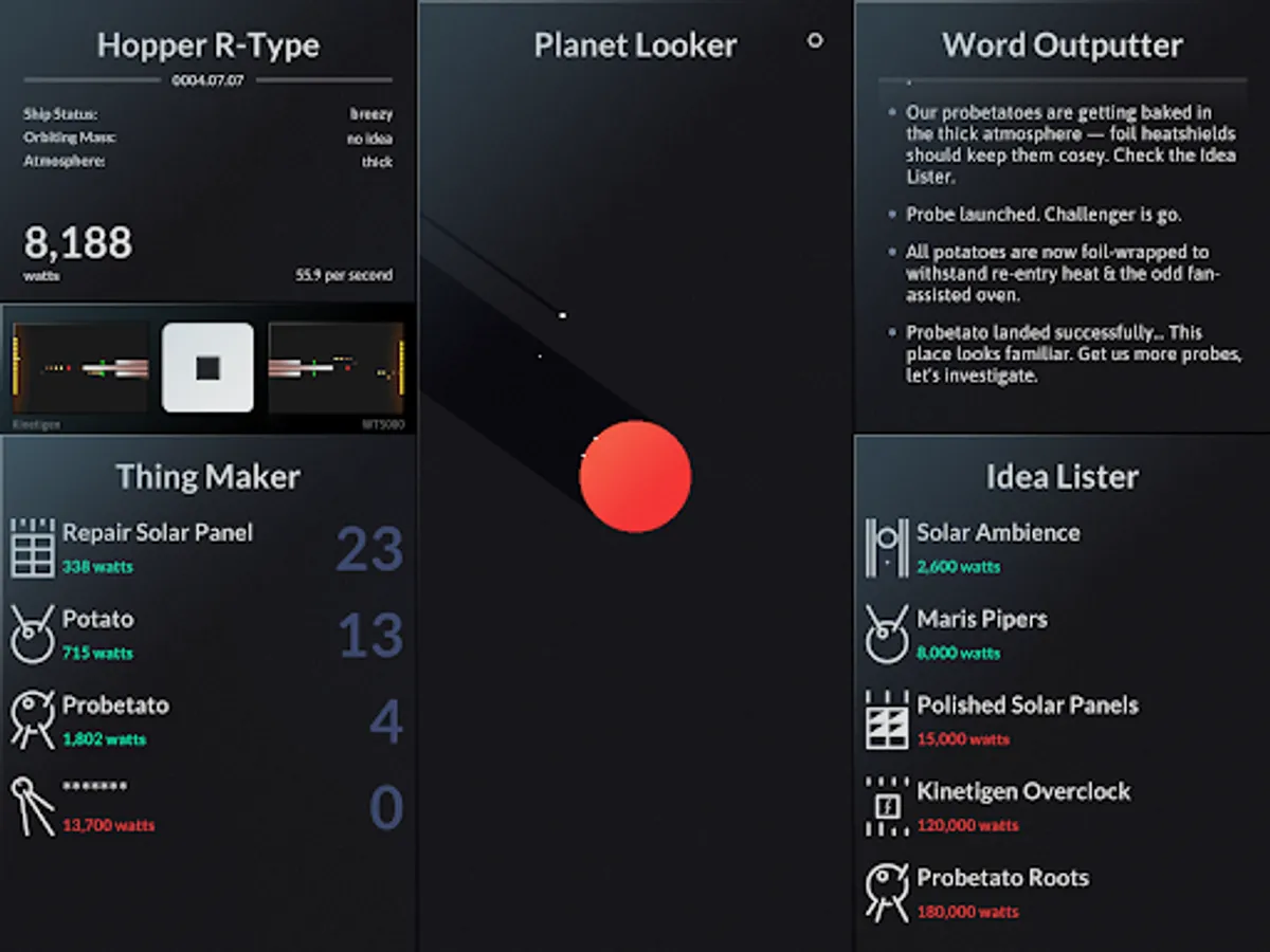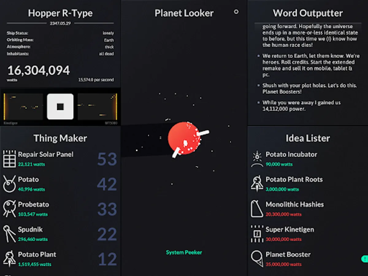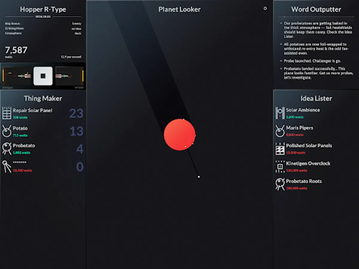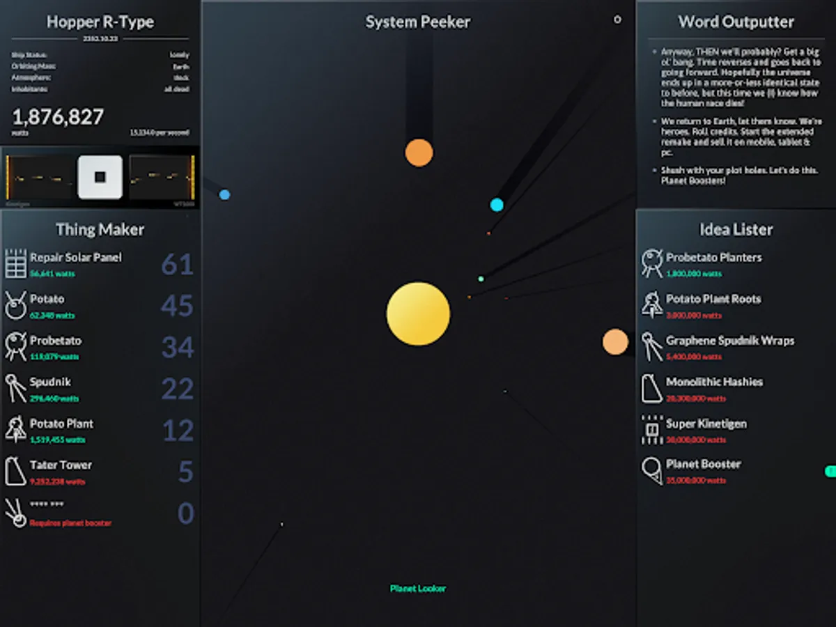 SPACEPLAN is an experimental piece of interaction based partly on a total misunderstanding of Stephen Hawking’s A Brief History of Time. Use manual clicks and the passage of time to create and launch potato-based devices and probes from your nondescript satellite orbiting a mysterious planet. Unlock the mysteries of the galaxy or just kill some time in what the astrophysics community is calling the ‘best narrative sci-fi clicker game of all times’.