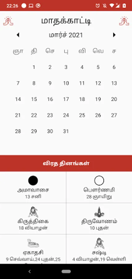 ✓ Month view - Monthwise Amavasai, Pournami, Kirthigai, Sasti, Pradosham, Ekadasi, Chaturthi, Sivarathiri, Thiruvonam, Sangadahara Chaturthi Information.