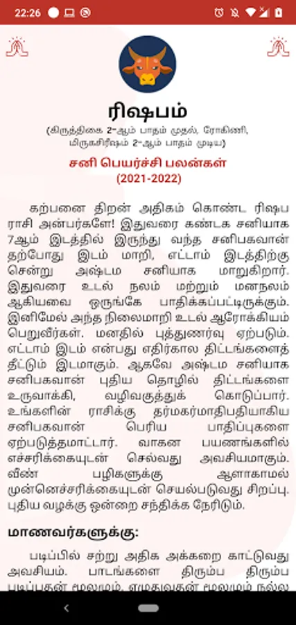 We have added all the functionalities and Information such as Daily Rasipalan, Panchangam, Auspicious and Inauspicious Times, Guru, Sani, Rahu ketu Peyarchi palangal, Suba Muhurtha days, Full moon, no moon and all Viratham Days.