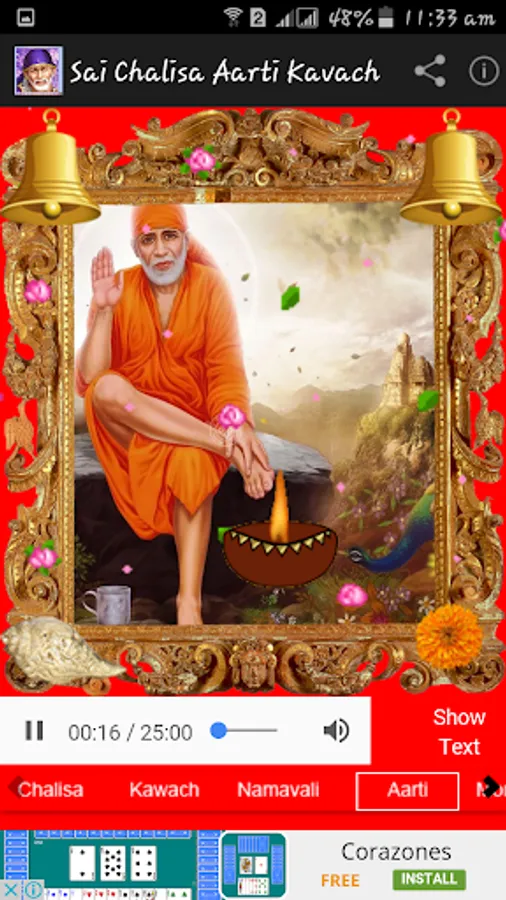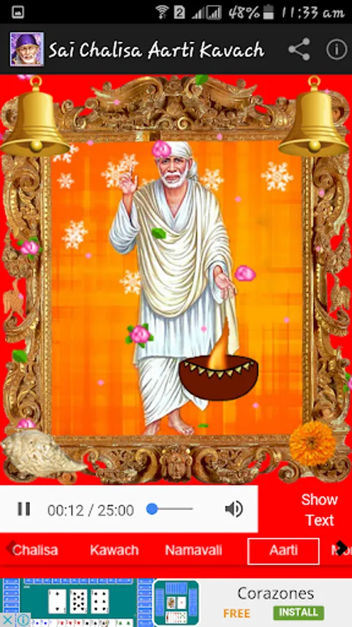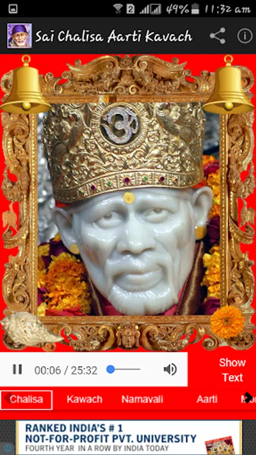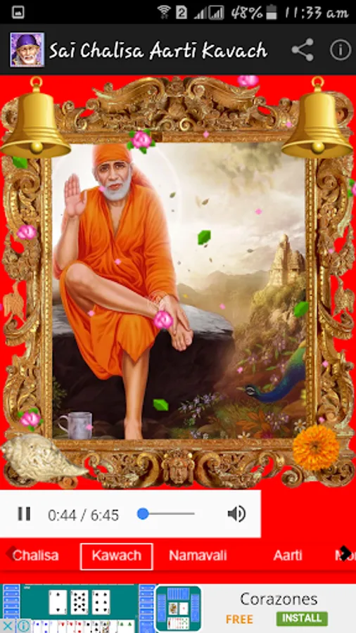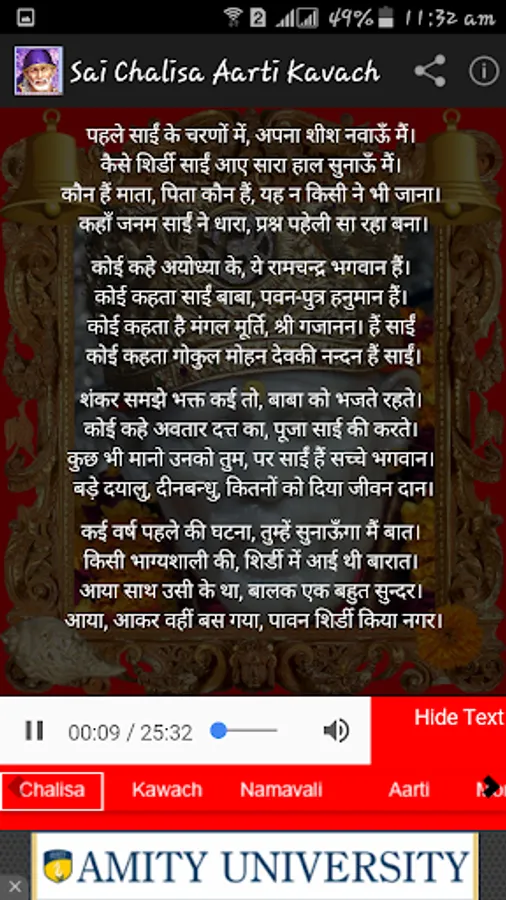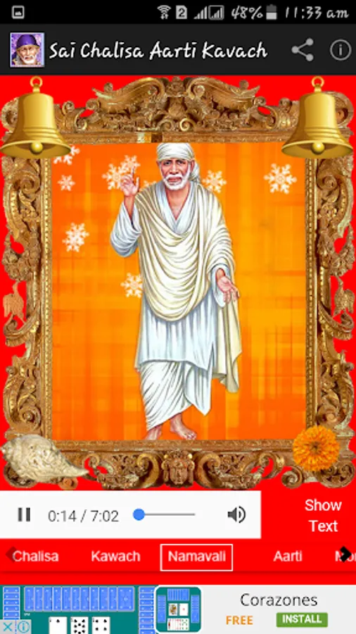You will be happy to see such a nice collection with great presentation to Read and Listen or read with listen the Sai Chalisa,Sai Baba ki Aarti and Sai Kavach with shell शंख & bell sounds and beautiful flower flow on the Sai Baba ji by clicked on shell, bell and flower simultaneously in one single application with Lyrics and Mp3 Audio.