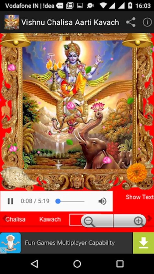 You will be happy to see such a nice combination in one single application with Lord Vishnu Chalisa, Lord Vishnu ji ki Aarti and Kavach in Audio and text format.